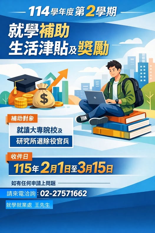 114學年度第2學期退除役官兵就學補助生活津貼及獎勵海報
