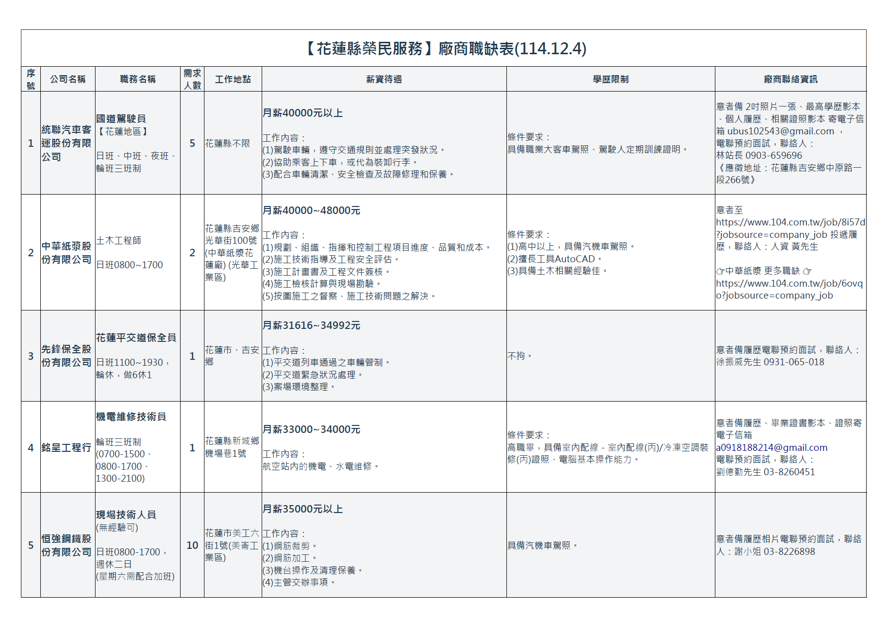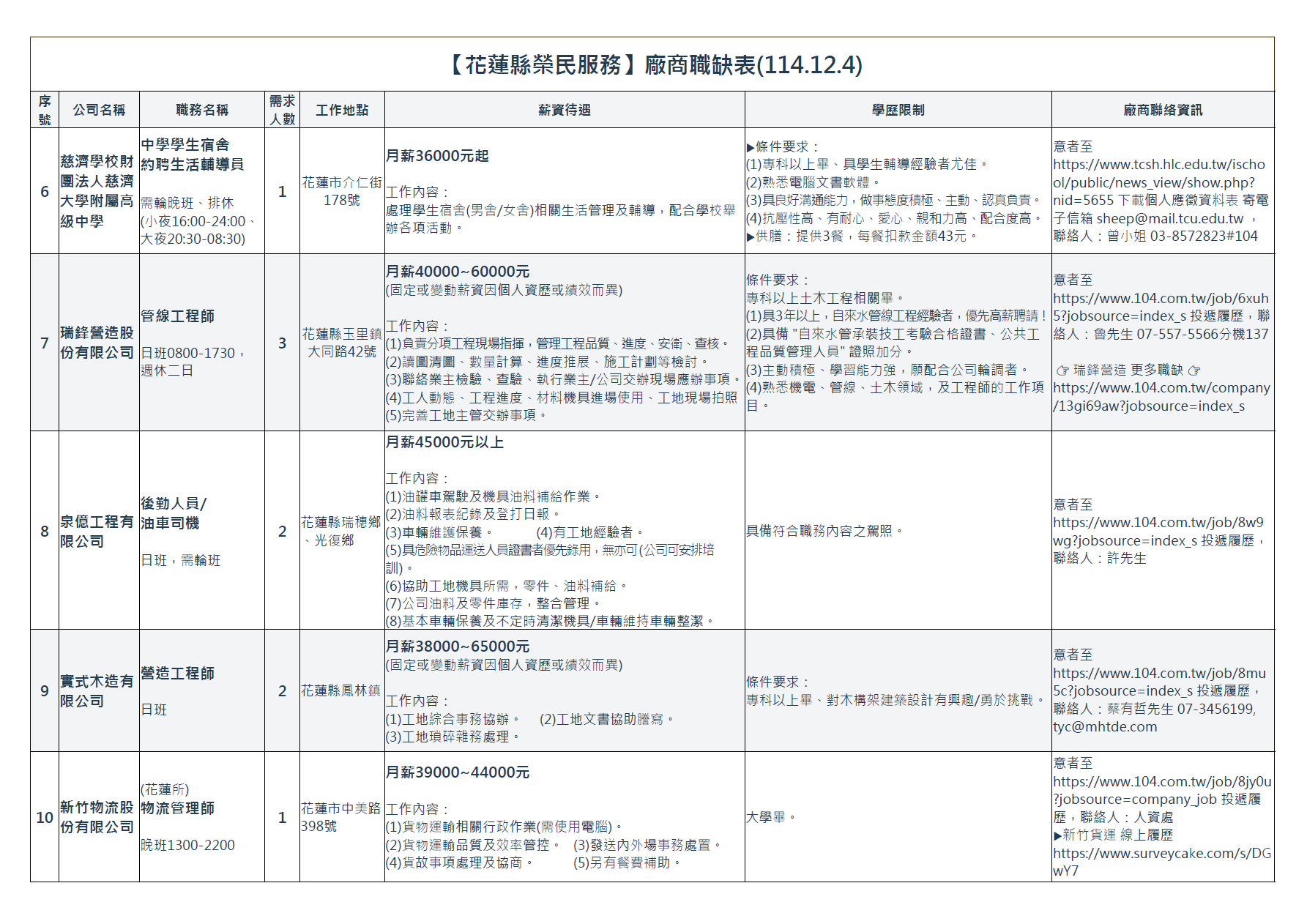 【花蓮縣榮民服務處】廠商職缺表(114.12.4)