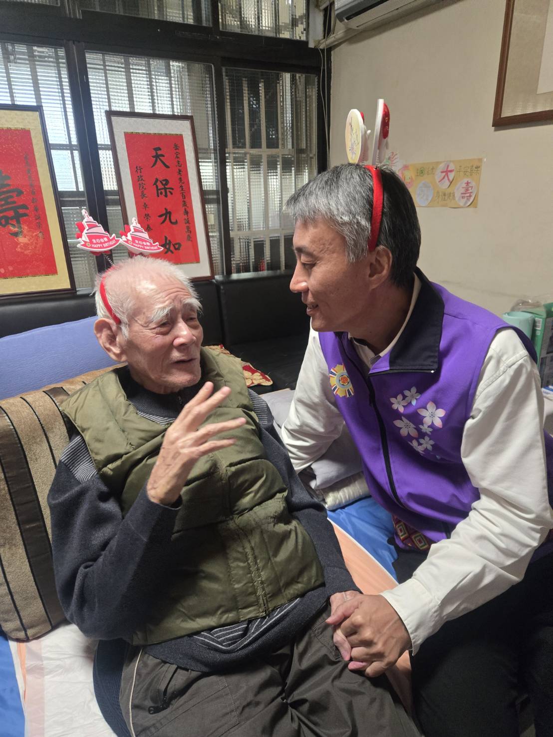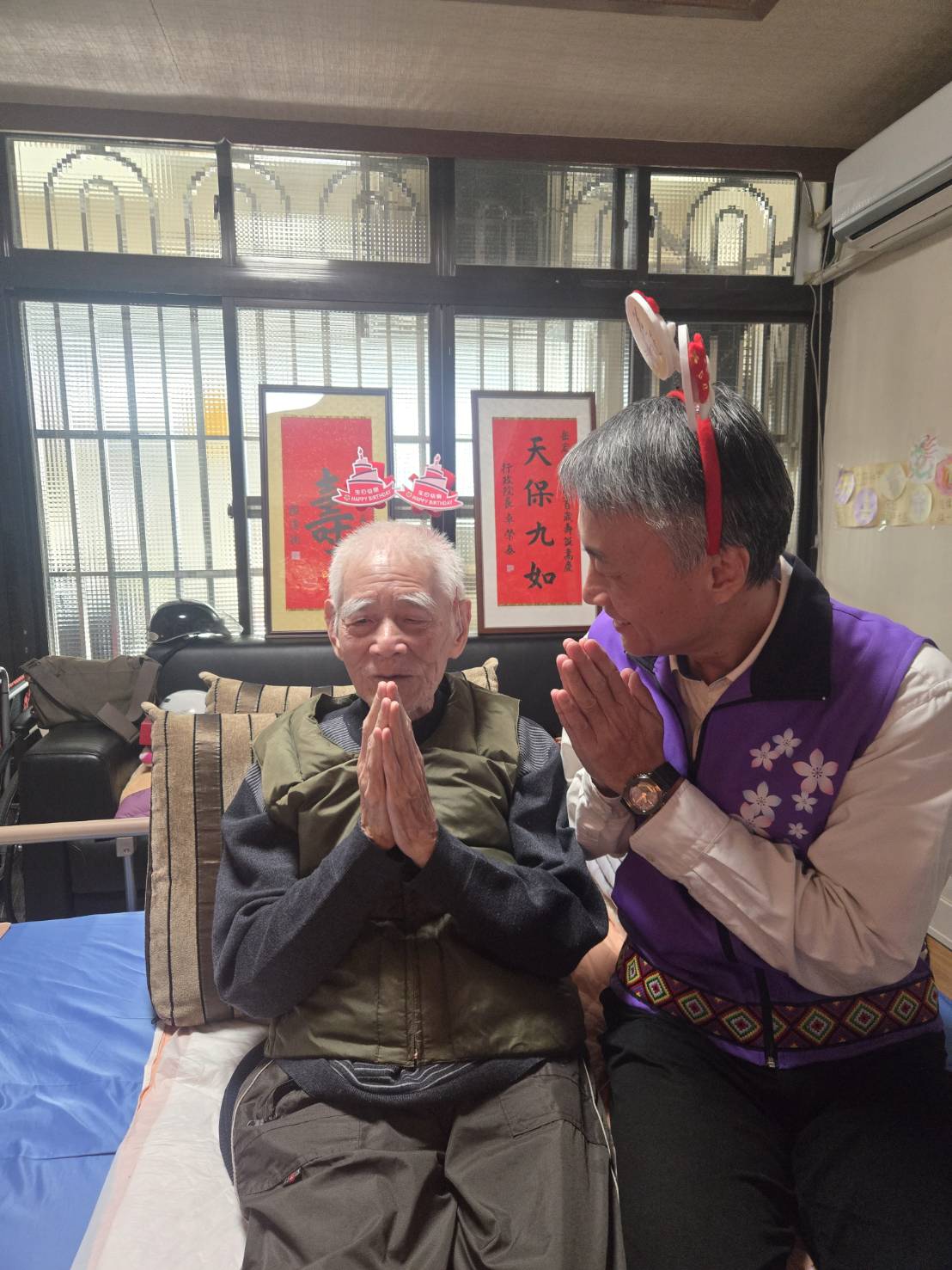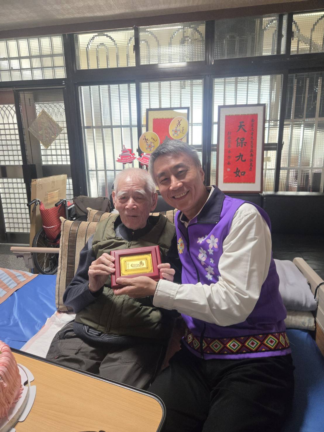 岳宏志爺爺,民國十五年生,對人生際遇心懷感恩。 年屆百歲無法站立行走,但身體健康硬朗, 兒子們事業有成,家庭和樂融融, 對於晚年生活有退輔會照顧及榮服處關懷十分感恩。 花蓮縣榮服處由處長蕭振嘉到府為其致贈總統府及行政院祝賀壽屏及輔導會紀念金飾,