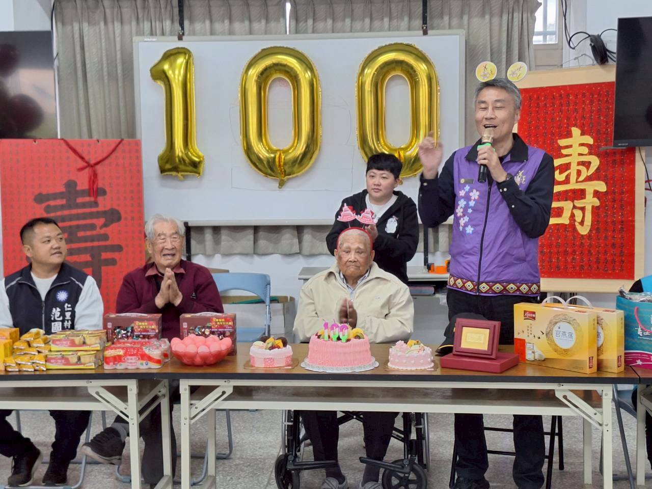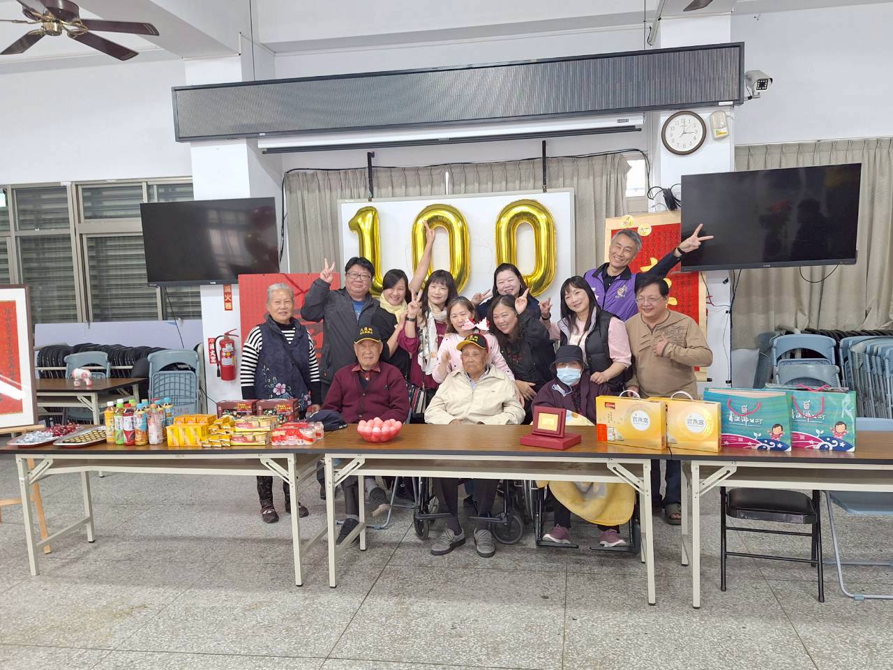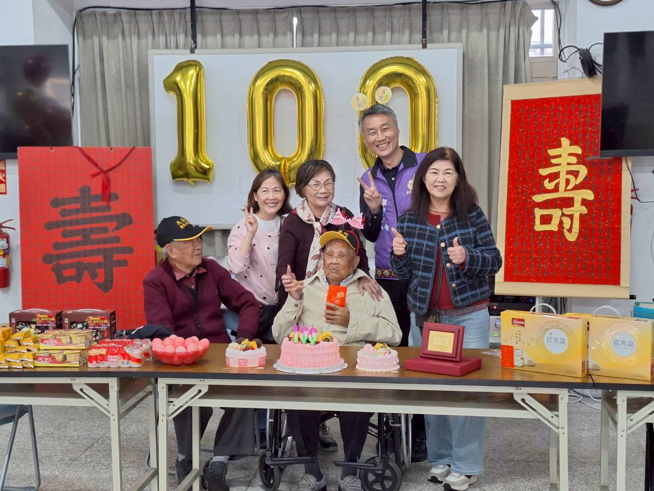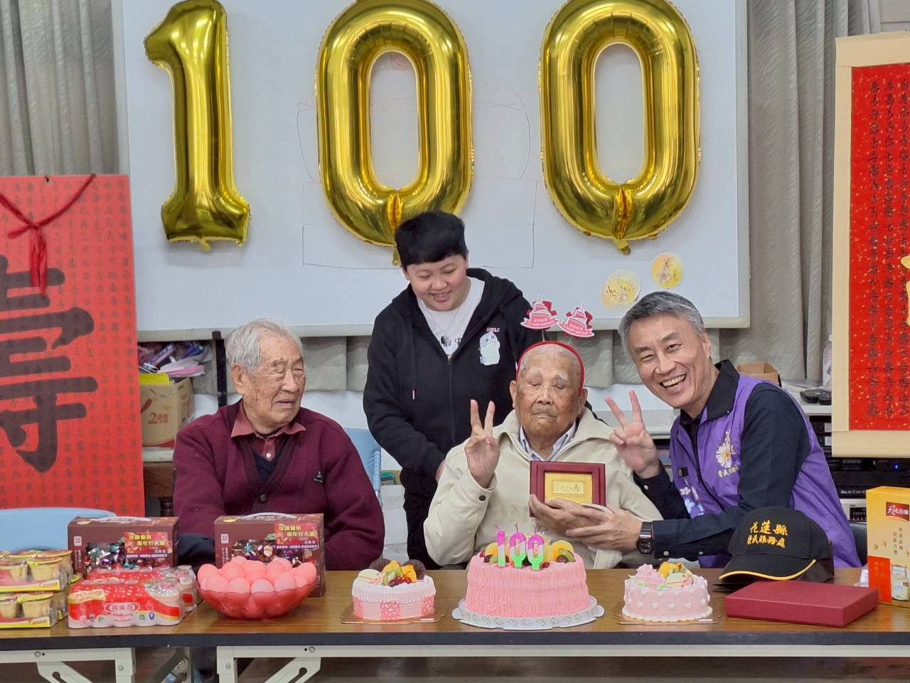 陳功雲伯伯,民國16年2月2日出生,四川省重慶市合川縣人,少年時投身軍旅,那槍桿子比人高,於是被派至國軍54醫院工作,後經訓練加入中央防空學校,民國37年空軍防校駐地北平,剿匪作戰,後隨軍來臺,於空軍花蓮基地上士消防班長退役,婚後與妻子育有二子二女,支領微薄退休俸難支付一家大小經濟開銷,他早晨送報、兼職木工賺錢養家。陳功雲爺爺年輕時用性命守護國家,為社會家庭付出心力,現今白內障導致青光眼,視力大不如前,眼盲心卻很樂觀的陳爺爺,退休後生活純樸簡約,生活作息規律正常。 欣逢百歲壽誕,透過慶生活動表達榮服處對資深榮民的照顧,也讓為國家犧牲奉獻的榮民,感受到輔導會及榮服處的用心。 花蓮縣榮民服務處於30日在仁里村活動中心為爺爺慶生,蕭振嘉處長轉頒總統及行政院長祝賀壽屏、輔導會祝壽紀念金飾及營養燕窩禮盒,吉安鄉游淑貞、仁里村村長范國昌均前來祝福,親友們也一同道賀,祝賀話語溫馨感人,現場充滿無限喜樂,慶生活動就在祝壽人員懇切關懷聲中圓滿結束。