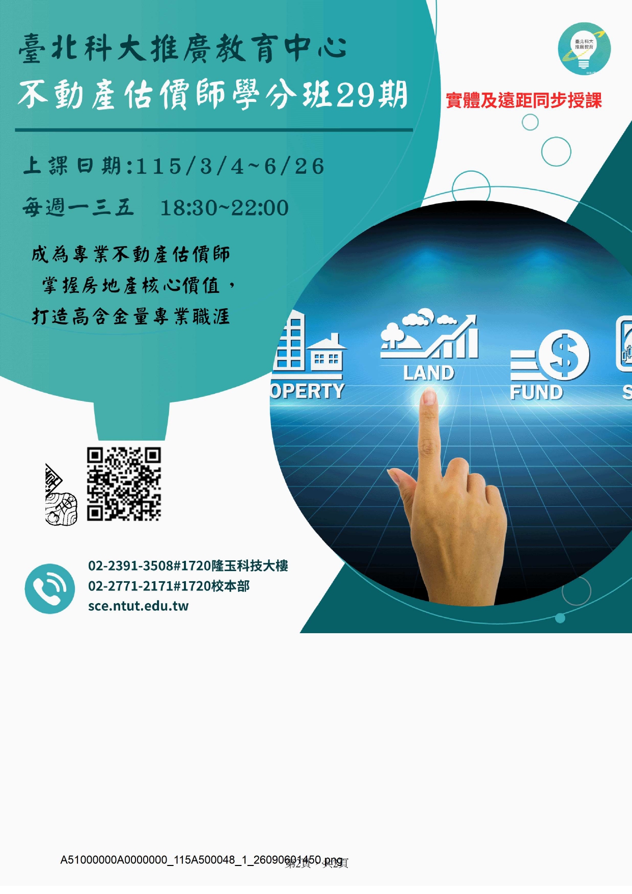 國立臺北科技大學進修部推廣教育中心「不動產估價師學分班29期(遠距同步)」招生訊息上課日期:115年3月4日至6月26日。 上課時間:每周一、三、五,18時30分至22時。 報名網址:國立台北科技大學 如有任何疑問,請洽本處就學業務承辦人吳小姐06-9212112#117。