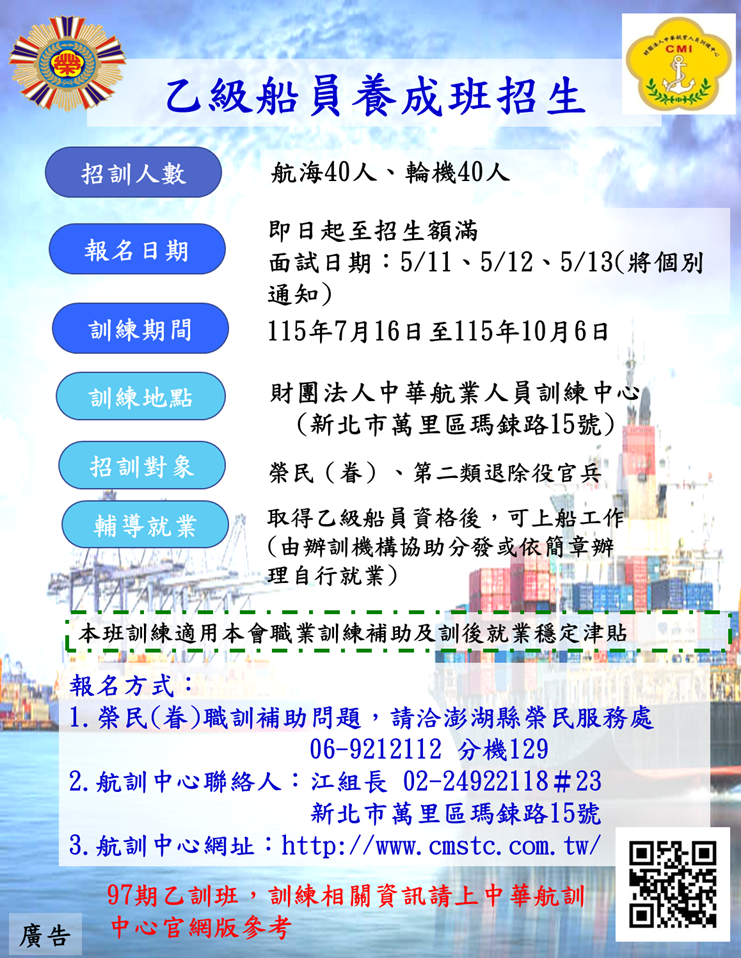 【產訓合作班】115年乙級船員養成班第97期 招生資訊 •報名日期:即日起自115年5月4日止。 •訓練期間:115年7月16日至10月6日。 •訓練地點:財團法人中華航業人員訓練中心(新北市萬里區瑪鍊路15號)