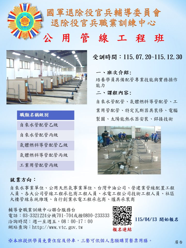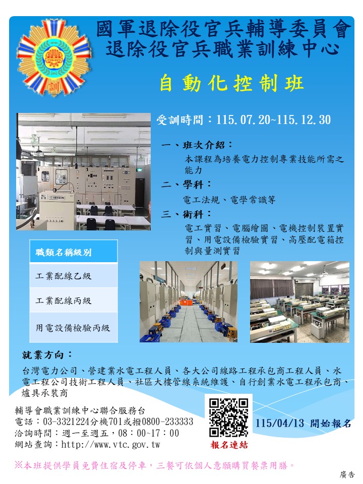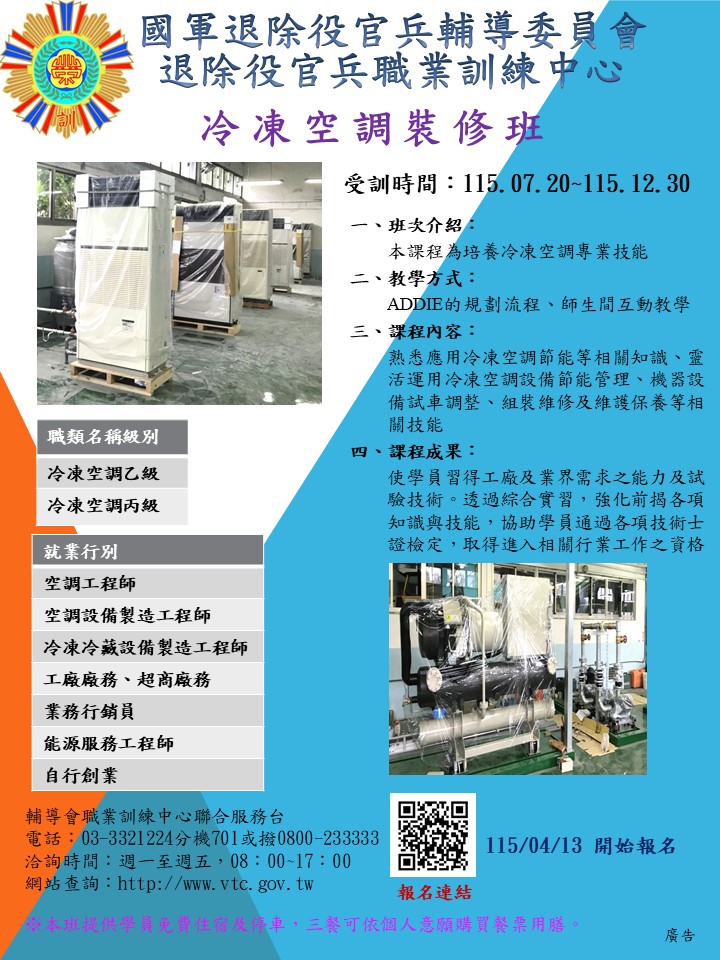 退輔會職訓中心自辦訓練-自動化控制班、冷凍空調裝修班、公用管線工程班 開始報名!