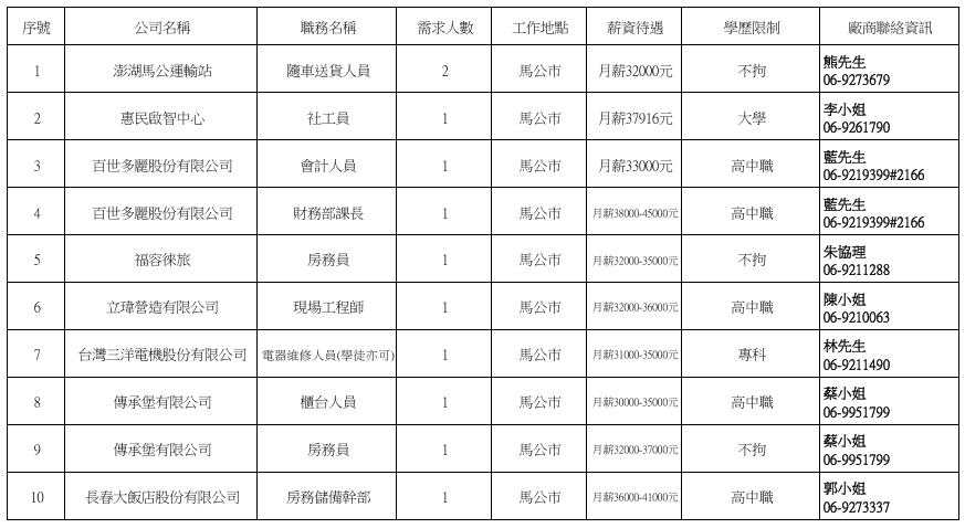 【澎湖縣榮服處】廠商職缺表(115.01.05)