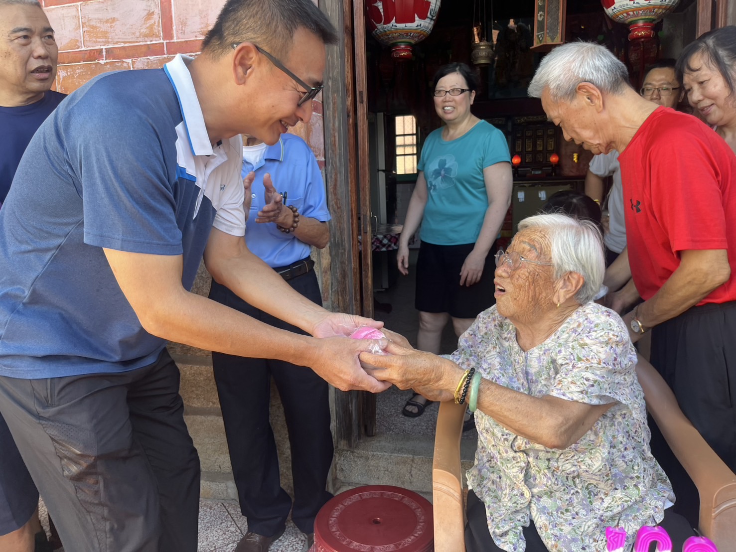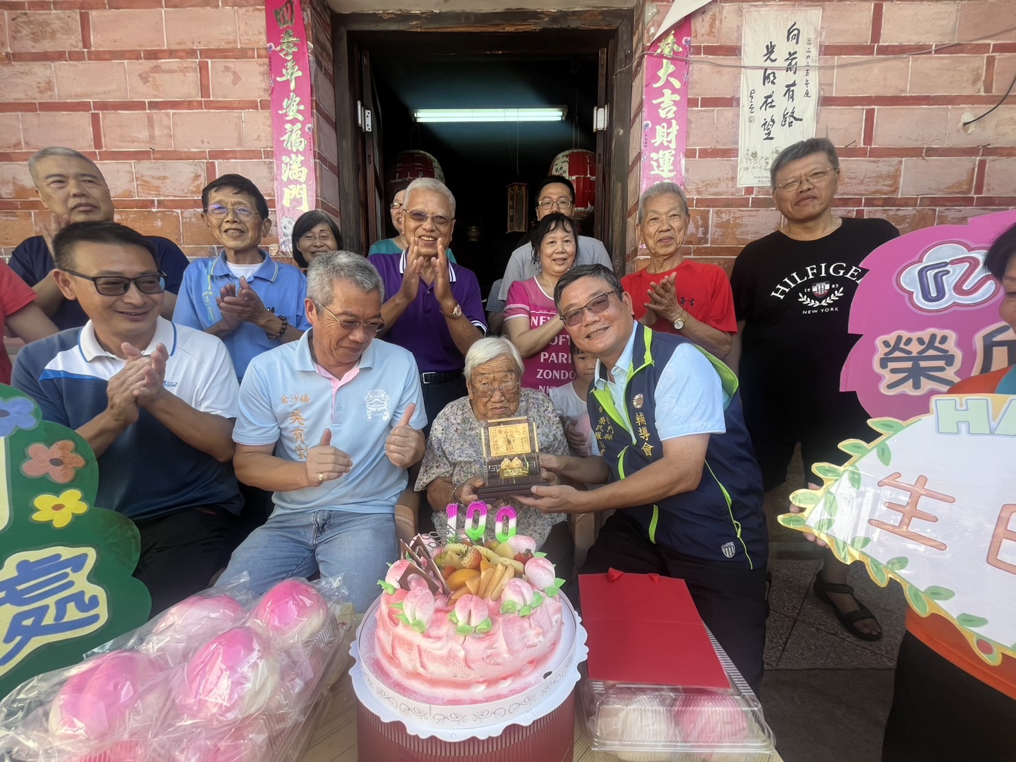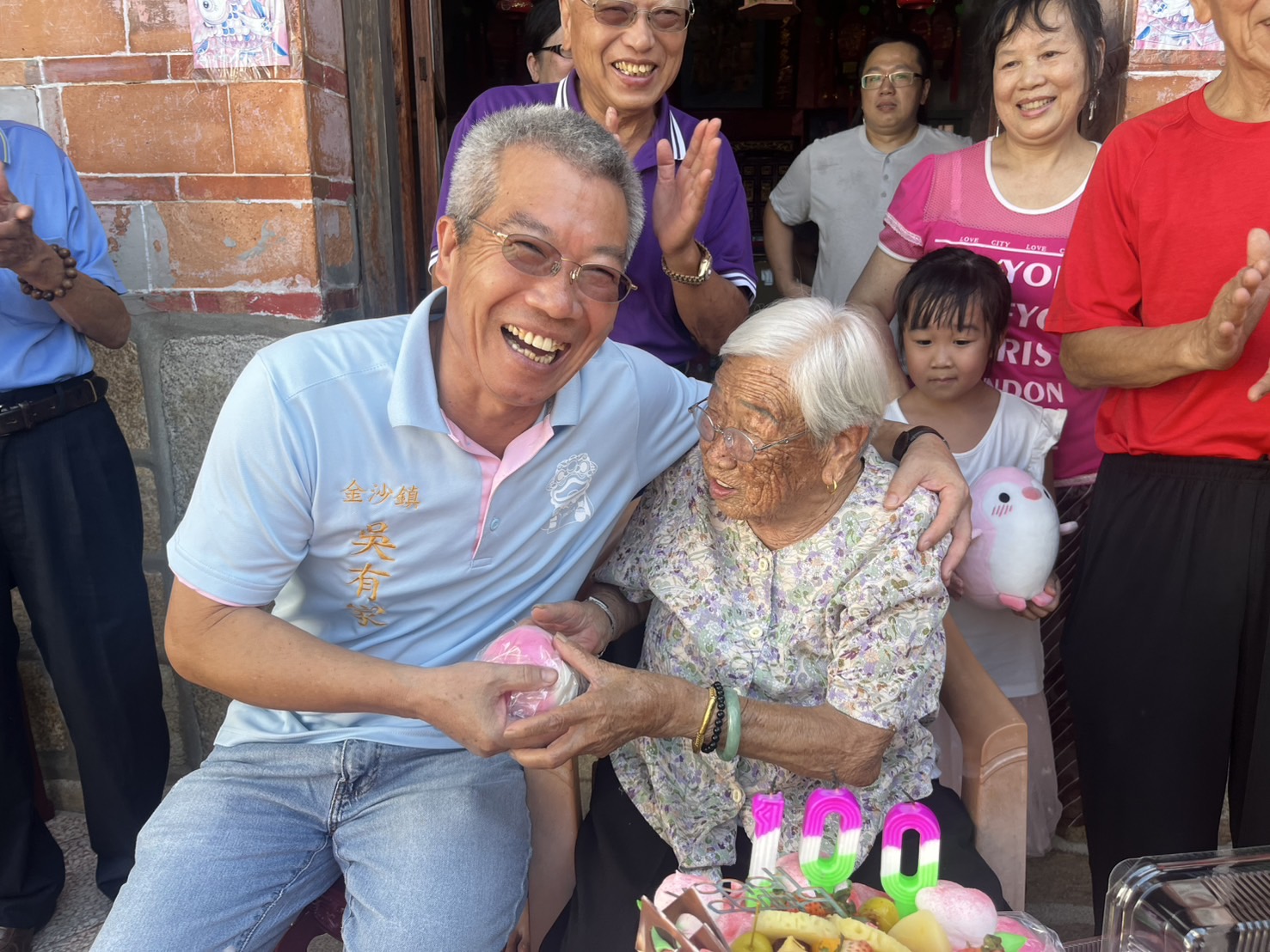 金門縣榮民服務處劉信義處長今(11)日率領總幹事李全順、業務承辦人汪成飛輔導員、榮欣志工承辦人許丕懌助理員及榮欣志工前往金沙鎮沙美楊奶奶家中歡慶百歲壽誕,除轉贈總統賴清德及行政院院長卓榮泰祝賀「壽屏」,並代表輔導會主任委員嚴德發致贈「金壽桃」,獻上對壽星最深的祝福;活動邀請金沙鎮吳有家鎮長、汶沙里張瀚龍里長共襄盛舉,現場熱鬧喜悅,所有貴賓隨後在劉處長帶領下高唱生日歌、切蛋糕、送壽桃,一起分享百歲人瑞的福氣,活動過程溫馨圓滿。 楊載牧奶奶出生於官澳,16歲出閣嫁至沙美,夫妻情深,共育有6子2女。家中世代務農,勤儉持家,個性隨和、不與人爭,每日生活規律,作息正常,早睡早起,飲食清淡,生性樂觀開朗。子女各自成家立業,開枝散葉,四代同堂、子孫近百人,其中不乏教授、醫師等社會賢達,家庭和樂、令人稱羨。如今兒孝孫賢,讓她感到無比欣慰與知足。楊奶奶並對政府照顧長者的社福資源及榮服處的貼心關懷表達由衷的感謝,期盼年輕一輩能知福惜福、積極向上,為國家社會善盡一份心力。 劉信義處長表示,昨天是中華民國114年雙十國慶,在這光輝十月、普天同慶的日子裡,特別前來為楊奶奶祝壽,意義格外非凡,在看到她如今依然身體健朗、精神矍鑠,令人倍感欣慰,楊奶奶則感動地握著劉處長的雙手,滿懷感謝與喜悅地表示,衷心感恩政府與榮服處長期以來的關懷,讓她深深感受到社會的溫暖與幸福。劉處長指出,我們感念先賢的犧牲與奉獻,才有今日國家的繁榮昌盛,也特別感謝楊奶奶一生對國家的無私付出,同時也藉此機會向曾參與823戰役的金馬自衛隊榮民們致上最高敬意,感謝這群默默奉獻的無名英雄。榮服處將持續秉持服務熱忱,提供最貼心、最適切的照顧服務。 相關照片