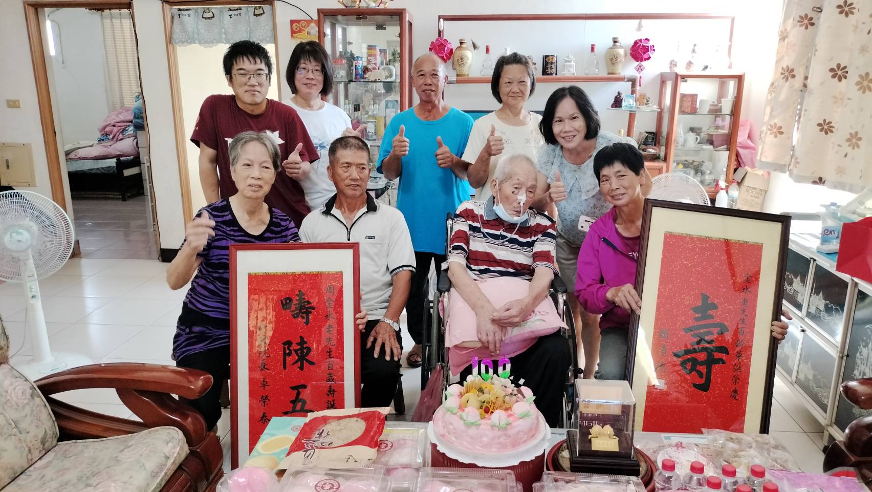 金門縣榮民服務處劉信義處長今(15)日率領副處長彭致和、業務承辦人汪成飛輔導員、第一責任區蘇俊雄輔導員、洪學文社區服務組長、榮欣志工承辦人許丕懌助理員及榮欣志工,至金寧鄉百歲榮民周金水伯伯家為長輩慶生,劉處長代表輔導會嚴德發主任委員,獻上金壽桃一座與總統府、行政院壽屏各乙幀,並祝周伯伯生日快樂、松柏長青。 本次慶生活動地方政府出席的有金門縣政府陳成勇秘書、金寧鄉公所楊雅芳秘書、金寧鄉代表會陳家慶秘書,縣府陳秘書代表縣長陳福海致贈祝壽酒,鄉公所楊秘書代表鄉長楊忠俊致贈祝壽金,並在唱完生日快樂歌後一同切蛋糕,整個活動在熱鬧又溫馨的祝福聲中圓滿結束,家屬對各級長官前來祝賀表示感激及肯定,希望能讓大家同沾周伯伯福氣。 周伯伯是自衛隊榮民,出生於15年次的他正好經歷島上最動盪的時代,兒時先是遇到日軍佔領金門、抗戰勝利後又因國共內戰,緊接著遇上古寧頭戰役、八二三砲戰等戰役,其一生跟島上大部分的自衛隊榮民一樣,可說是經歷了一部我國近代戰爭史。長子表示,父親靠著做粗工及農作,含辛茹苦把2子6女養大成人,熬過人生最艱辛的歲月,而老人家個性敦厚,與鄰居相處融洽,凡街坊有婚喪喜慶必定主動前往幫忙、守望相助,周伯伯在子女心中塑造了「平凡中見不平凡」的偉大形象。 劉信義處長表示,服務照顧榮民為輔導會主要工作,百歲人瑞壽辰更是普天同慶之盛事。金門地區的每位自衛隊榮民雖未直接參與戰爭,但幾乎是長年生活在戰爭動亂之中,必須參加各種軍事訓練、協助輔助勤務,往往傷亡的程度比正規部隊還大,是他們用生命保衛了家園,再次由衷感謝這群無名英雄。 相關照片