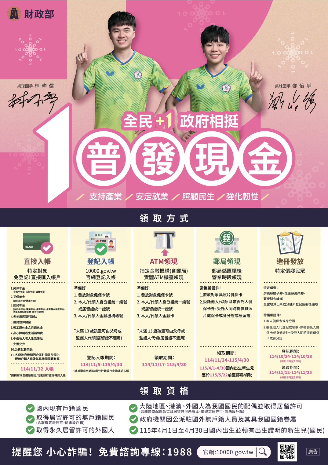 財政部有關「全民+1 政府相挺」普發現金發放作業需知