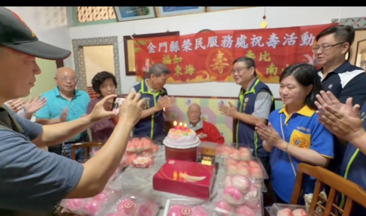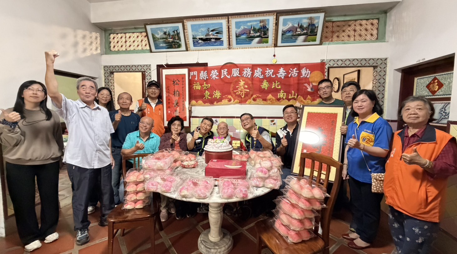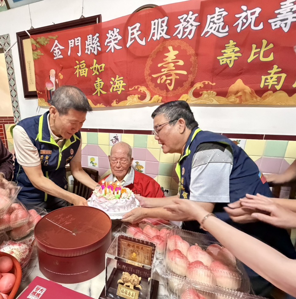 金門縣榮民服務處處長劉信義於今(18)日率李全順總幹事、汪成飛輔導員、蔡承坤社區服務組長及榮欣志工等人,共同前往金湖鎮小徑蔡爺爺府上祝賀百歲壽誕,瓊林里里長蔡懷芝亦到場表達祝賀;活動中除轉贈賴清德總統及行政院院長卓榮泰致贈之賀壽壽屏,並代表輔導會主任委員嚴德發致贈象徵長壽吉祥的「金壽桃」。現場在眾人齊唱生日快樂歌、切蛋糕及致贈壽桃的溫馨氛圍中,洋溢歡樂與祝福,場面溫馨感人。 蔡爺爺生於民國16年,為瓊林人,與妻子蔡周金枝女士於民國38年結婚,育有4子4女。早年生活物資匱乏,夫妻二人胼手胝足、相互扶持逾一甲子,鶼鰈情深,令人敬佩。戰地政務時期,蔡爺爺曾擔任金馬自衛隊員,參與演習操課及運補支援等任務,期間曾親歷戰火,目睹同村隊員於砲火中殞命的慘況,所幸平安走過動盪年代,更顯其福澤深厚與生命韌性。如今子女皆已成家立業、開枝散葉,子孝孫賢,家庭和樂,蔡爺爺深感欣慰與知足。對於榮服處長期以來的關懷照顧亦表達由衷感謝,並勉勵年輕一代知福惜福、積極向上,為國家社會貢獻心力。 劉信義處長表示,百歲人瑞是國家珍貴的資產,榮民前輩一生奉獻國家、守護家園,其精神值得世代傳承。今日社會的安定與繁榮,皆奠基於前人犧牲與付出,應心懷感念、珍惜當下。蔡爺爺親身歷經戰火歲月,更能體現和平的可貴。在此祝福蔡爺爺身體健康、「呷百二」,並向823金馬自衛隊這群默默付出的無名英雄致上最高敬意。未來榮服處亦將持續秉持服務與關懷的精神,提供榮民(眷)更完善與貼心的照顧。 相關照片