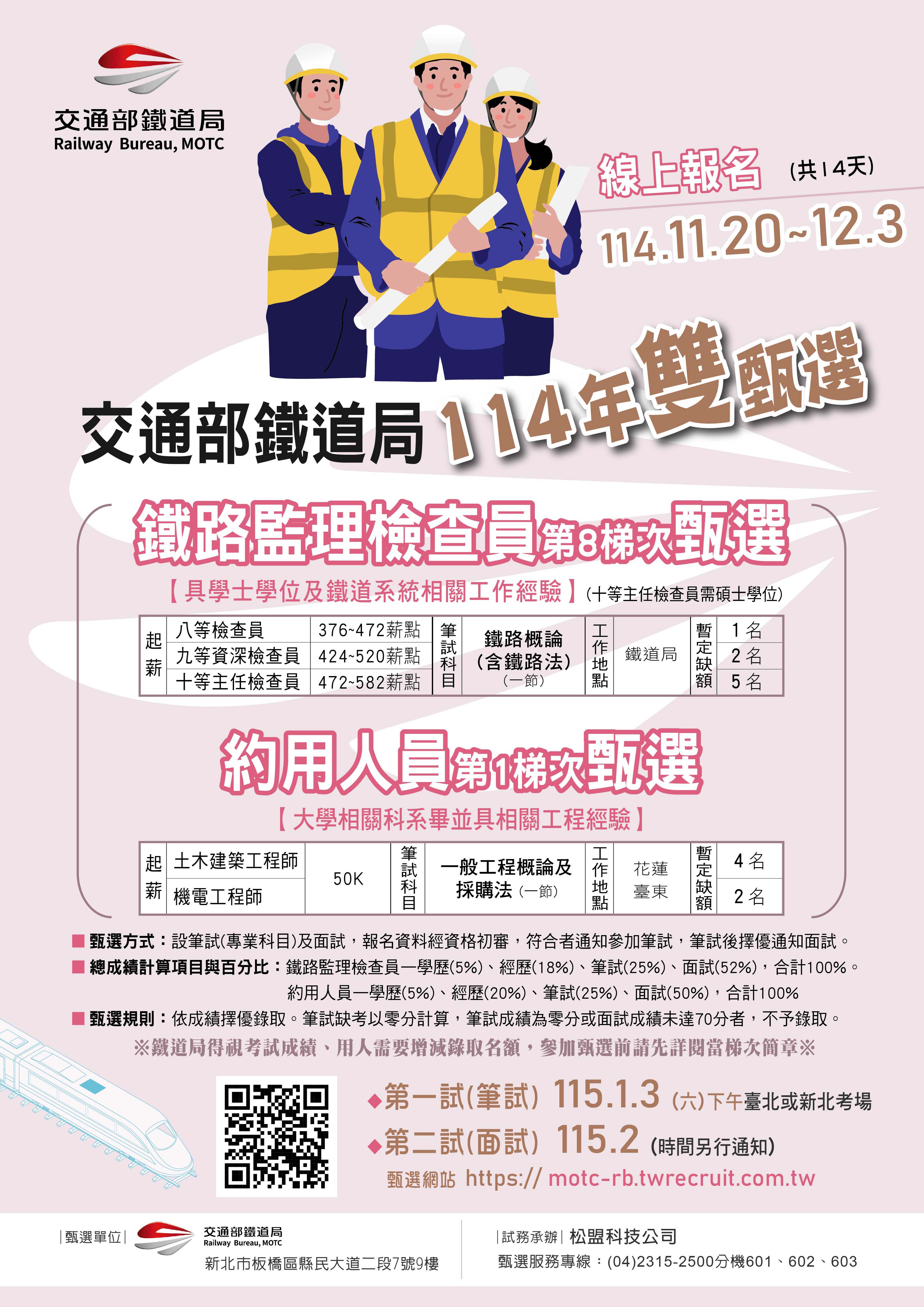 | 交通部鐵道局鐵路監理檢查員及約用人員甄選簡章(第1梯次).pdf | 114-11-27 | 10 |