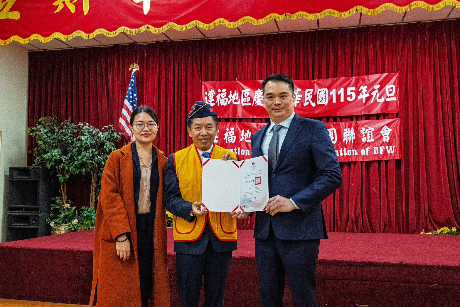 達拉斯榮光會承辦中華民國115年達福地區元旦升旗典禮,活動於二O二六年一月一日上午十點假達拉斯華人活動中心前廣場舉行,有駐休士頓臺北經濟文化辦事處陳育仁副處長,休士頓華僑文教活動中心 房亭妤副主任等長官出席,並進行頒發二0二五年僑社熱心貢獻獎感謝狀等儀式。