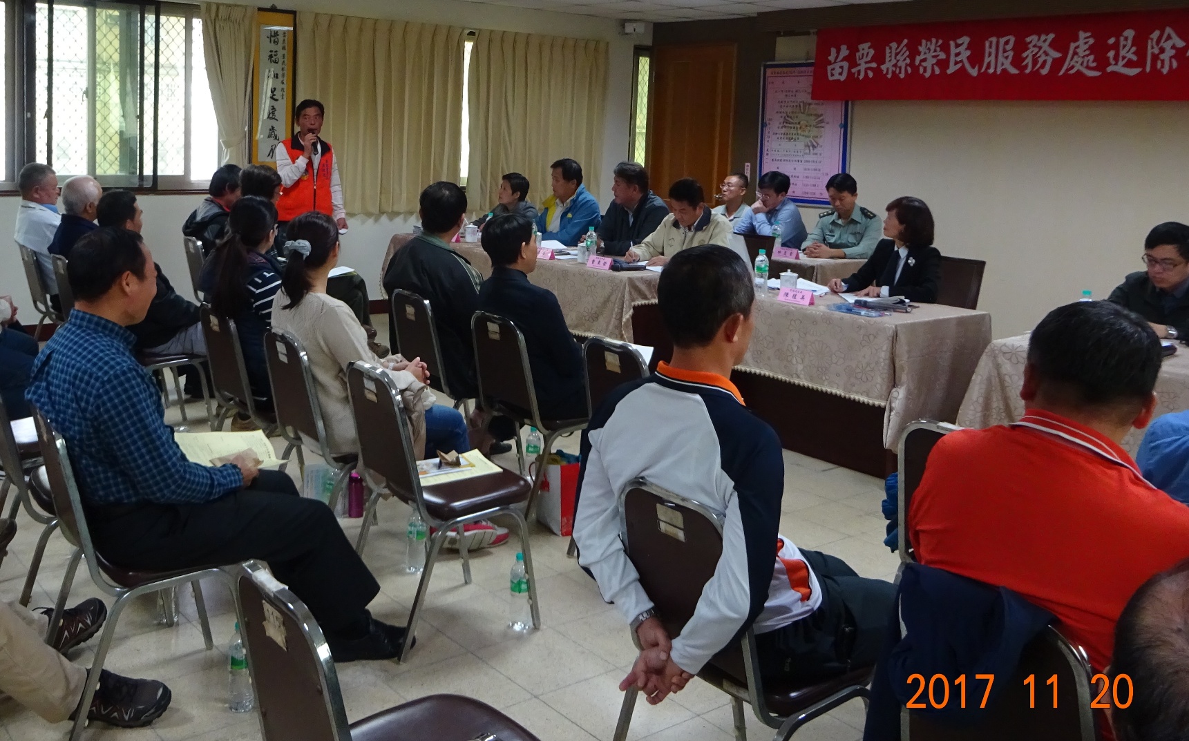 因應年金改革法案宣導,廣納建言,傾聽榮民榮眷心聲。苗栗縣榮服處於11月20日上午特舉辦「苗栗地區退除役官兵代表懇談會」,苗栗縣榮服處處長陳桂美,敦請輔導會相關業管處室主管,蒞臨苗栗縣榮服處宣導答詢相關問題,會議由處長陳桂美主持,並邀請地方首長及民意代表、國防部軍眷服務處、輔導會上級長官賀華專門委員等處科(室)長官代表、新竹榮民之家、台中榮總及苗栗縣內13個退伍軍人社團等單位,共同列席宣導政府執行政策並廣納民間意見,實現雙向溝通與意見交流。