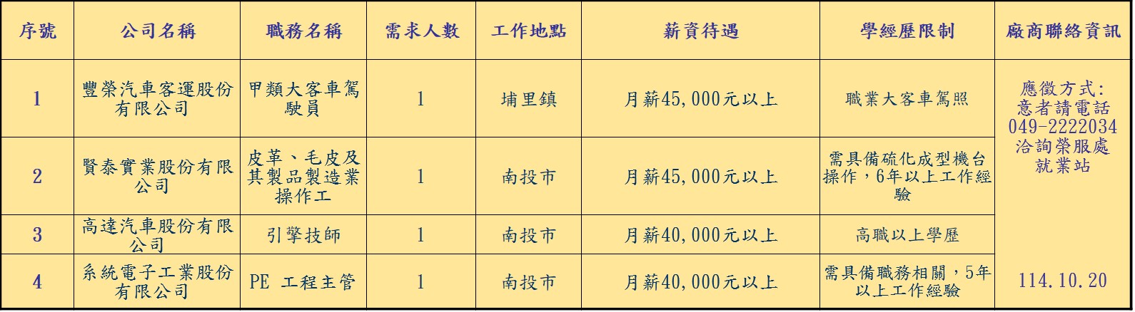 發布日期:114-10-20 資料來源:南投縣榮民服務處 【南投榮服處】廠商職缺表(114.10.20) 附件下載 檔案名稱 更新日期 下載次數 【南投榮服處】廠商職缺表(114.10.20).pdf 114-10-20 0