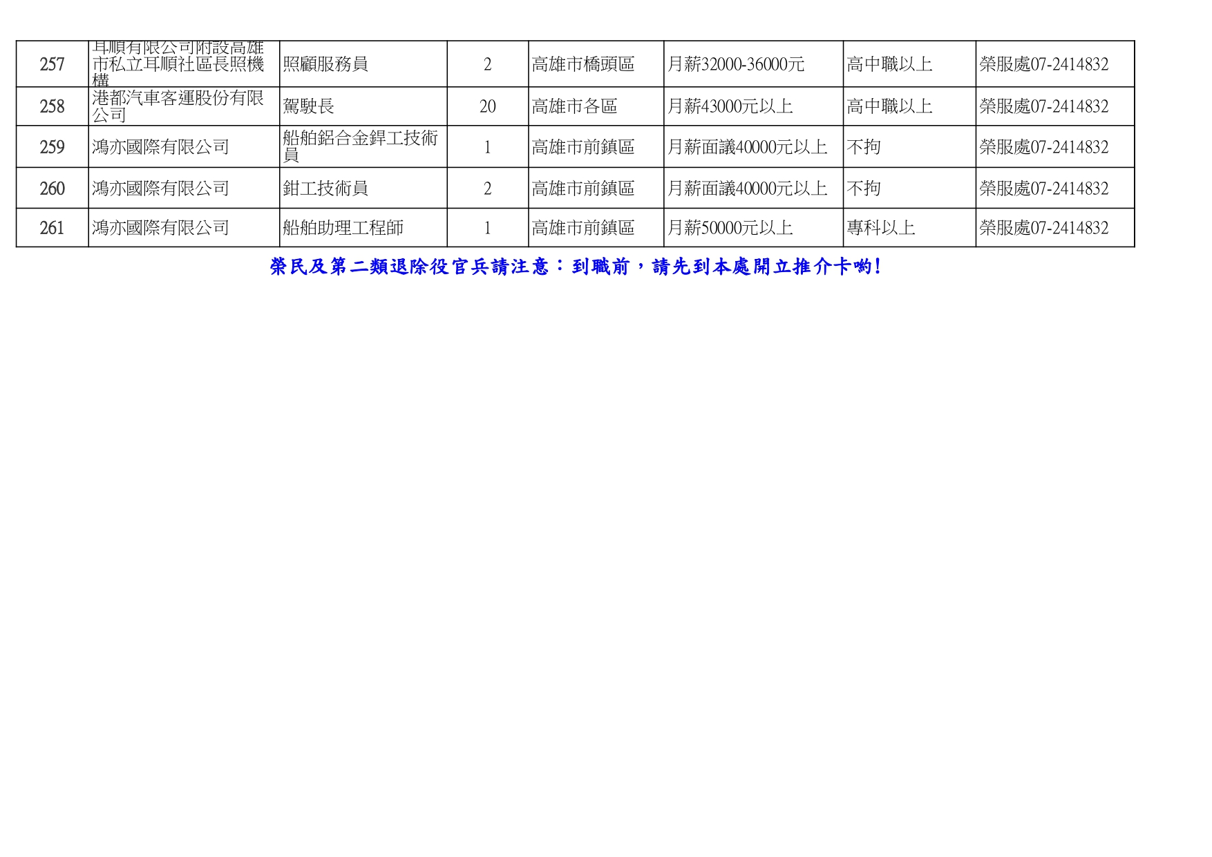 有就業需求之退除役官兵,請把握機會! 如有就(轉)業需求,歡迎洽詢本處就業站(07-2414832)