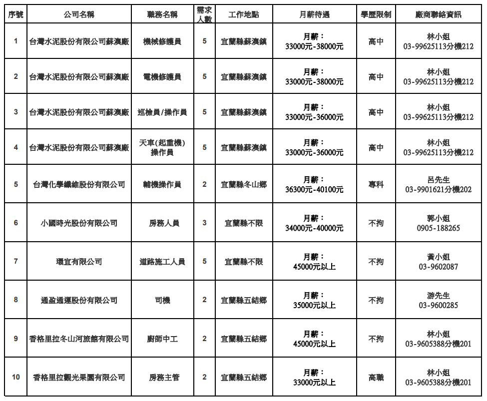 發布日期:114-10-03 資料來源:宜蘭縣榮民服務處 【宜蘭縣榮服處】廠商職缺表(114.10.06) 附件下載 檔案名稱 更新日期 下載次數 【宜蘭縣榮服處】廠商職缺表(114.10.06).pdf 114-10-03 2