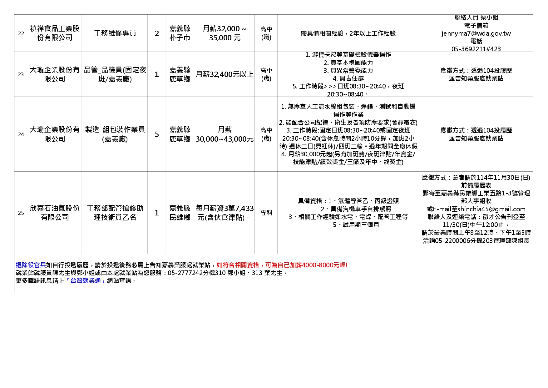 更多職缺訊息請上「台灣就業通」網站查詢。
