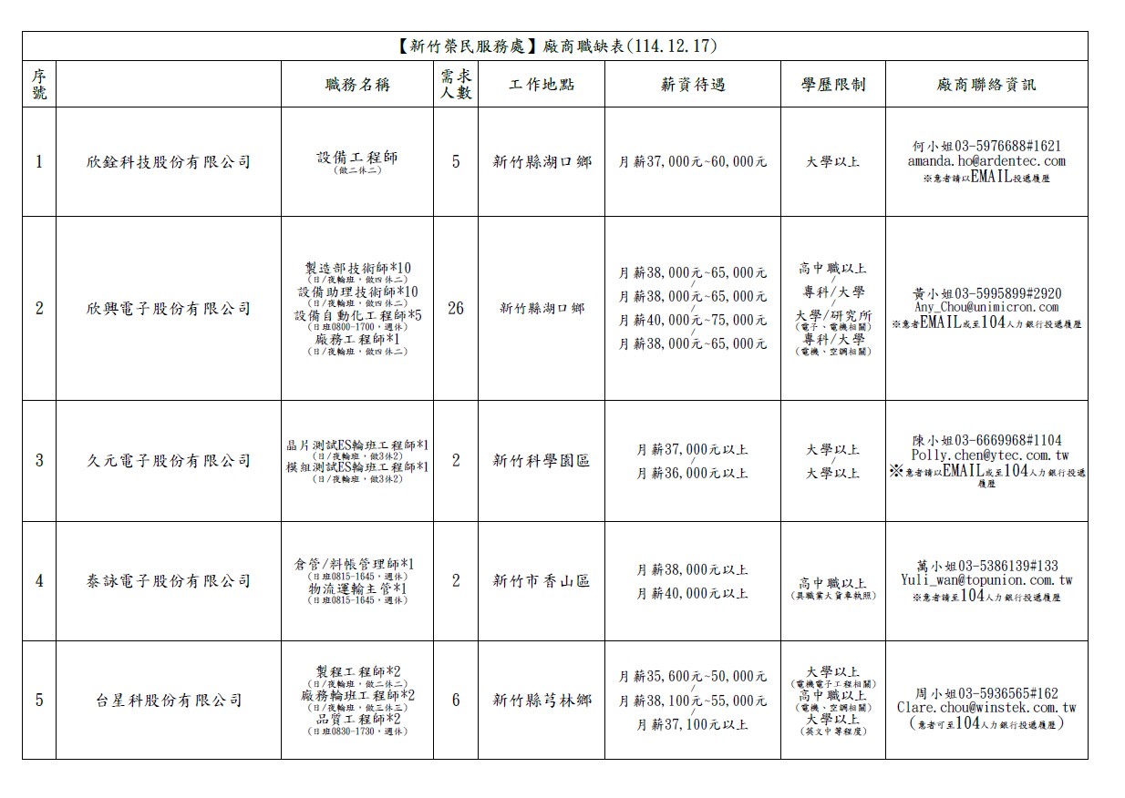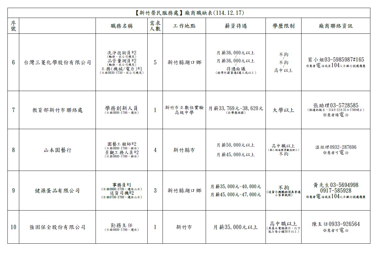 發布日期:114-12-17 資料來源:新竹榮民服務處 新竹榮服處廠商職缺表(114.12.17)【新竹榮服處】廠商職缺表(114.12.17) 相關照片 新竹榮服處廠商職缺表(114.12.17)-1 附件下載 檔案名稱 更新日期 下載次數 新竹榮服處廠商職缺表(114.12.17)--1.pdf 114-12-17 2