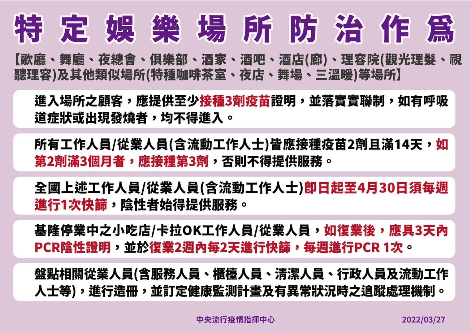 指揮中心快訊:4月1日至4月30日維持現行口罩等防疫措施,並強化特定娛樂場所防疫作為 因應Omicron變異株造成疫情感染逐漸升溫(3月27日本土83例確診),中央流行疫情指揮中心宣布,4月1日至4月30日仍維持現行標準為第二級,「北北桃高」住宿式長照機構維持「暫停訪客」,例外情形下提出申請後可進入探訪: 一、例外情形如下: 1、住民出現嚴重身心不適症狀,如失眠、血壓不穩、情緒暴躁,經機構無法安撫住民。 2、其他經機構評估有必要探視者(如:安寧緩和收案對象)。 二、例外情形探視條件如下: 1、陪伴者、新進陪住者、及目前北北桃機構因例外情形前往機構探視的訪客,必須完成基礎劑疫苗(第一、二劑)接種滿14天後,提出相關陰性報告或當日攜帶快篩試劑於本家協助進行快篩陰性後,始可進入探訪。 2、出示完整接種COVID-19疫苗紀錄 (1)紙本疫苗接種卡(小黃卡) (2)健保快易通APP (3)數位新冠病毒健康證明 指揮中心將視國內外疫情及實際執行狀況,適時機動調整防疫措施,強化邊境監測及防疫作為。籲請民眾應落實個人防護措施,主動積極配合各項防疫規範,以兼顧防疫與生活品質。 台北榮家關心您
