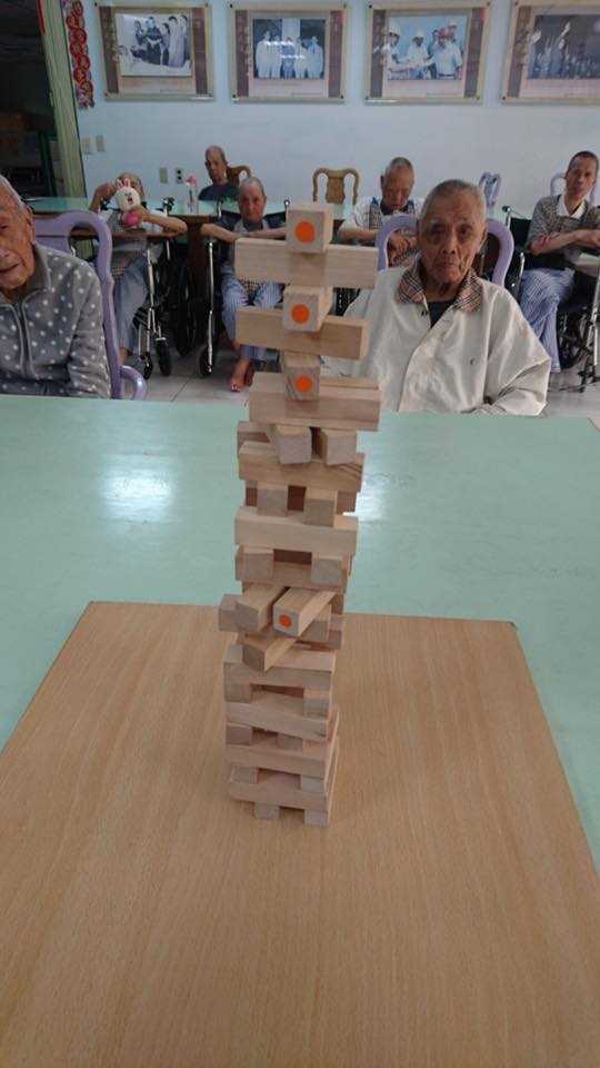 北榮職能治療許老師,帶動忘我園區的伯伯們疊積木。