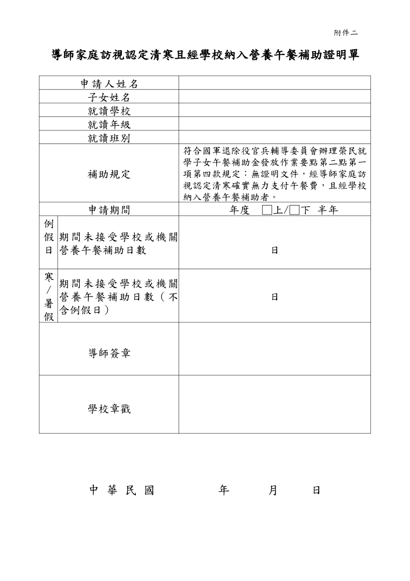 國軍退除役官兵輔導委員會辦理榮民就學子女午餐補助金發放作業要點附件二