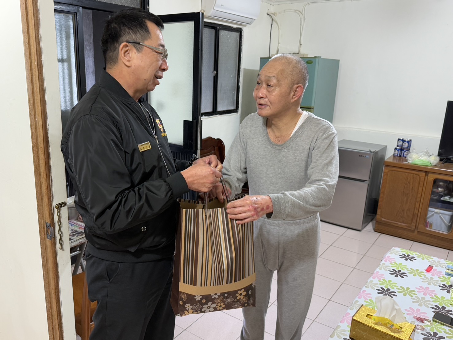 方正處長8日上午率責任區輔導員陳明哲及服務組長李文程至基隆市中山區訪視榮民眷,處長與榮民眷們溫馨話家常,關懷瞭解生活起居情形及需求,並提醒服務區內年長榮民眷注意身體狀況及活動安全,祝福長輩們身體康健,並保持心情愉快。 90歲陳伯伯目前與妻子同居,但因妻子中風臥床,需要長時間的照顧,陳伯伯仍認真及樂觀的看待一切,努力的給予妻子最好的照顧,服務組長也時常給予關心及相關協助,陳伯伯表示感謝榮服處平常的照顧及服務,處長特別前往關心其照顧情形及生活狀況,並致贈食物箱、蠶絲被等愛心物資表達榮服處關懷之意。 方正處長除關懷榮民眷們居家環境及生活狀況外,並請長輩們持續注意身體健康,保暖預防要多加留意,以及多多活動筋骨,並提前祝賀榮民眷們新年快樂。 相關照片