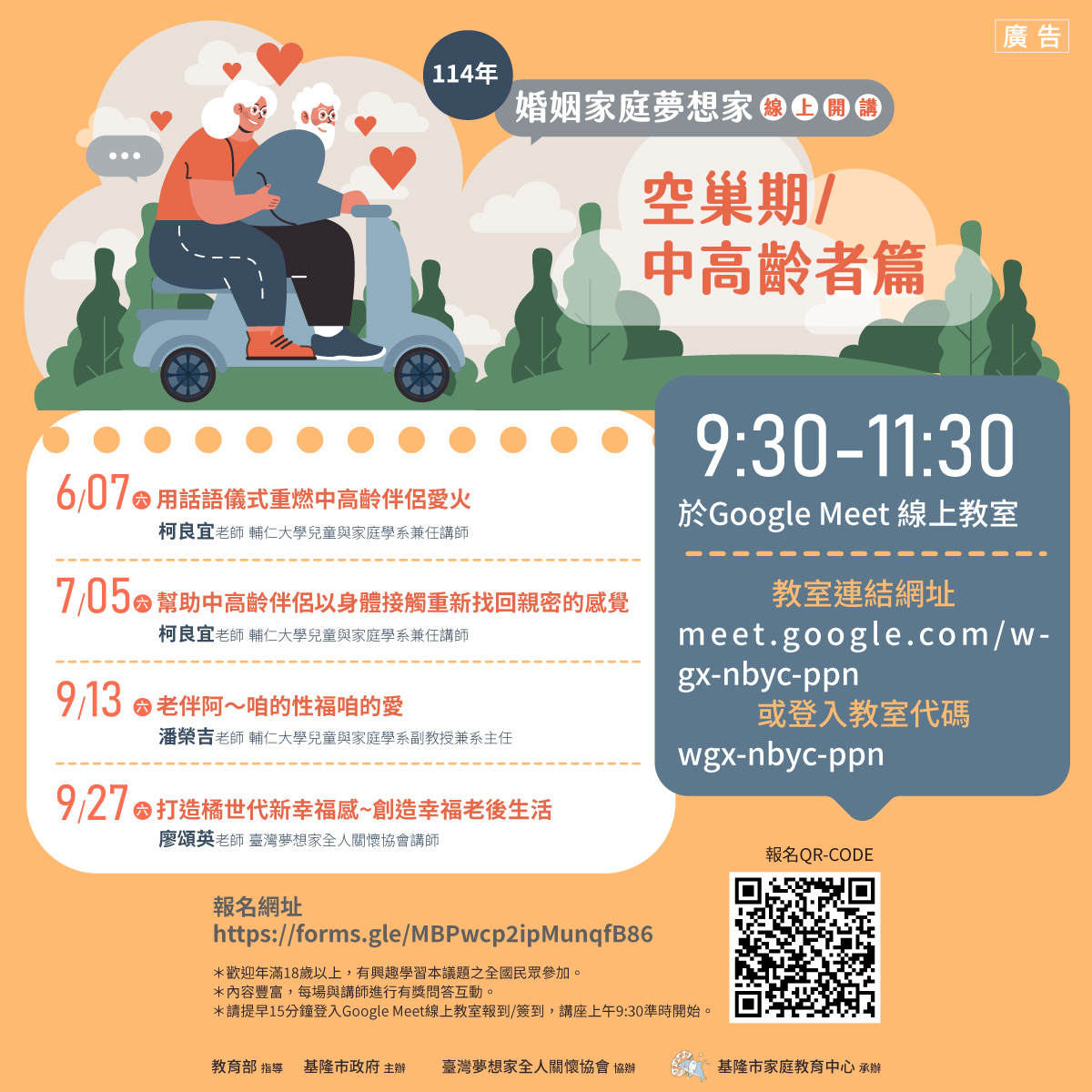 基隆市家庭教育中心辦理「婚姻家庭夢想家線上開講~空巢期/中高齡者篇」訂於114年6月7日、7月5日、9月13日、27日(週六)上午9:30-11:30在GoogleMeet線上教室舉行,邀請輔仁大學兒童與家庭學系兼任講師柯良宜老師與大家開講「用話語儀式重燃中高齡伴侶愛火」以及「幫助中高齡伴侶以身體接觸重新找回親密的感覺」,輔仁大學兒童與家庭學系副教授兼系主任潘榮吉老師與大家開講「老伴阿~咱的性福咱的愛」、臺灣夢想家全人關懷協會講師廖頌英老師與大家開講「打造橘世代新幸福感~創造幸福老後生活」等四個單元。 歡迎空巢期/中高齡者以及年滿18歲以上對本議題有興趣全國民眾報名參加。每場全程參加(無遲到、早退)之公務人員,本中心核給公務人員終身學習時數2小時。 報名網址https://forms.gle/MBPwcp2ipMunqfB86 或掃描活動簡章QR-Code報名(如附件)。
