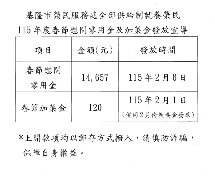 基隆市榮民服務處全部供給制就養榮民115年度春節慰問零用金及加菜金發放宣導