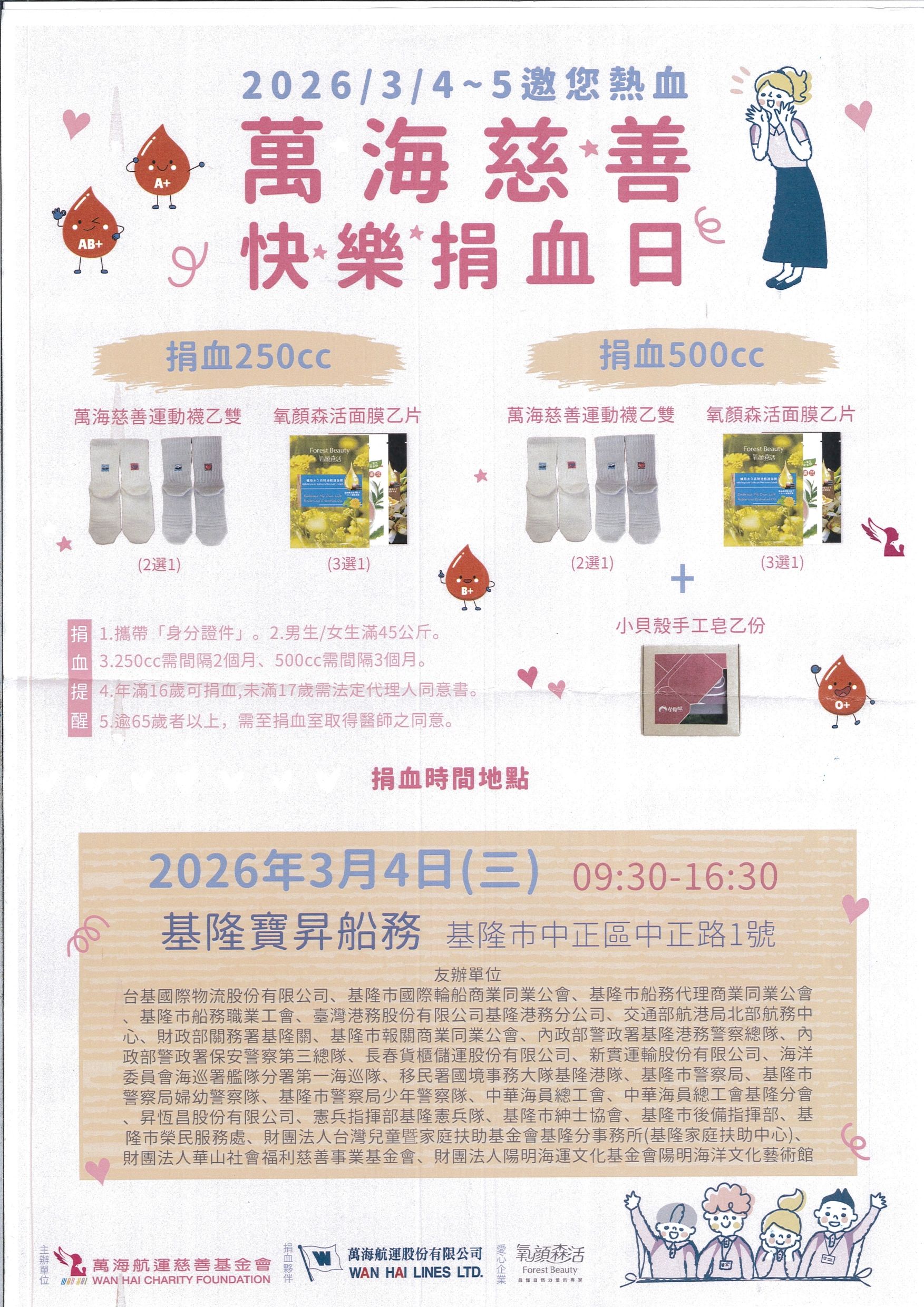 萬海航運社會福利慈善事業基金會為發揮博愛精神,落實社會回饋,敬邀共同參與捐血活動。 本次捐血活動於115年3月4日(三),時間:上午9時30分至下午16時30分止,地點於基隆市中正區中正路1號基港大樓東2倉間