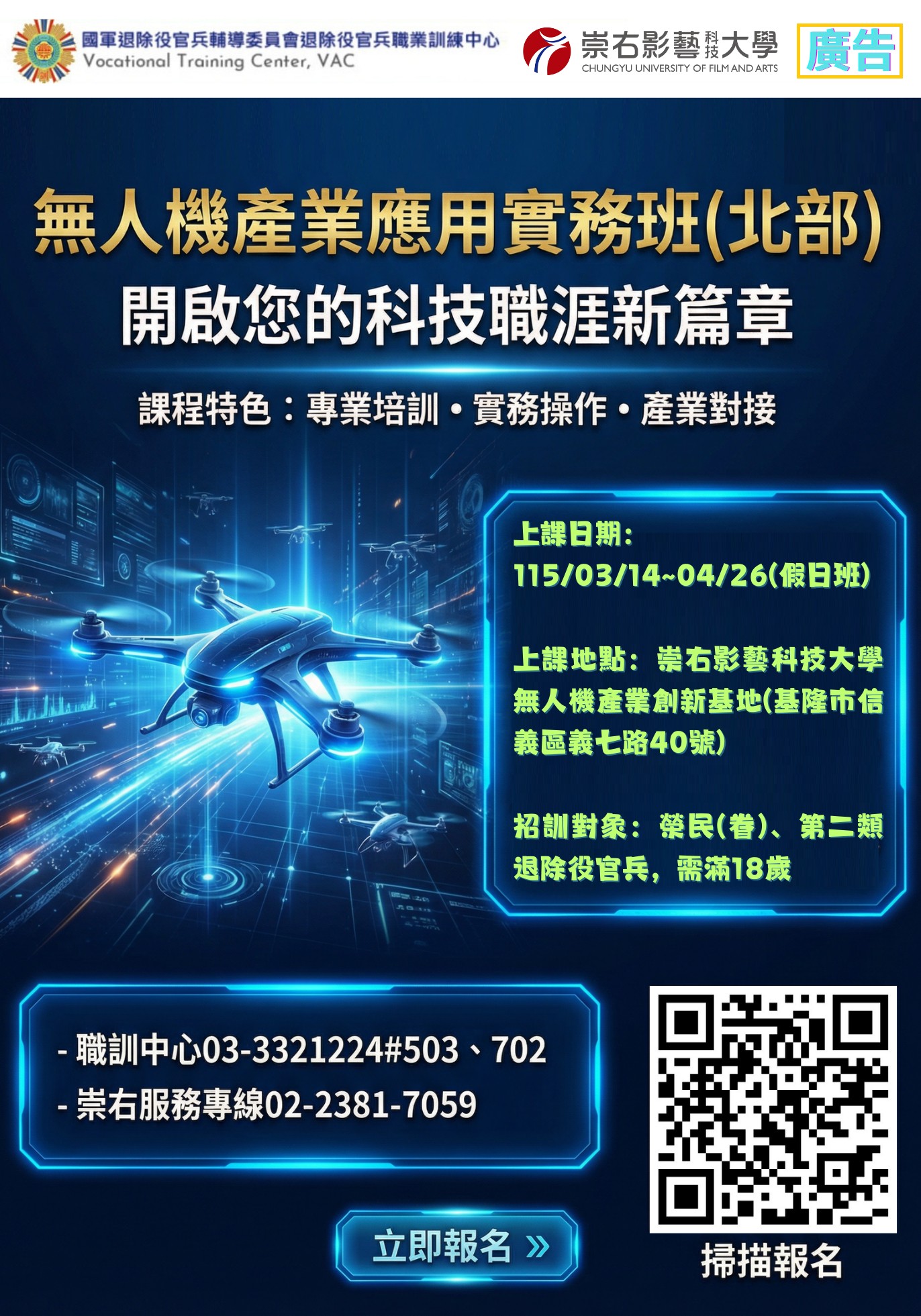 輔導會職訓中心委外班【無人機產業應用實務班(北部)】假日班 熱烈招生中