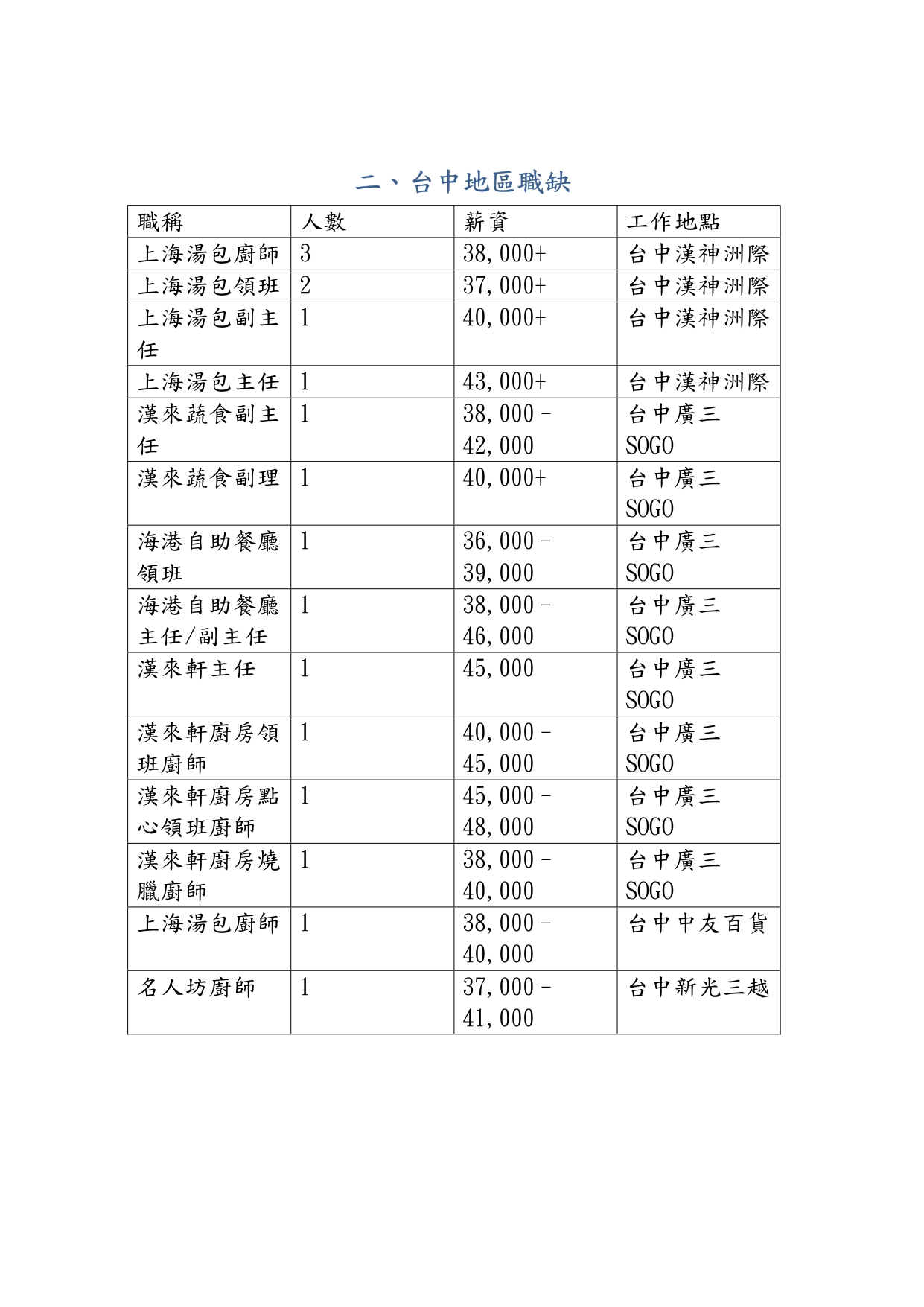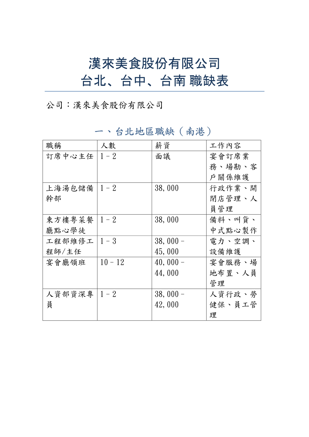 漢來美食股份有限公司職缺表-1