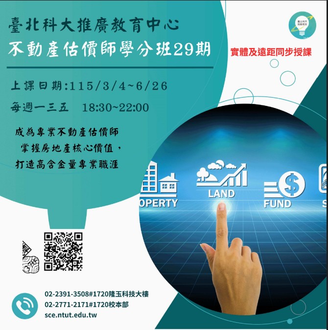 【大專校院進修補助訊息】 國立臺北科技大學進修部推廣教育中心「不動產估價師學分班29期(遠距同步)」招生 上課日期:115年3月4日至6月26日。 上課時間:每周一、三、五,18時30分至22時。 **本班可申請大專校院進修補助**詳情請洽05-5322742#8030