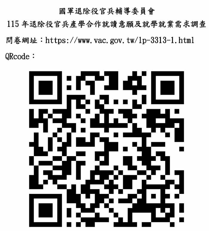 輔導會為瞭解退除役官兵就讀產學合作意願及就學就業需求,作為推動115年產學合作參考,製作問卷調查,再請各位撥冗透過以下連結填寫問卷,謝謝https://docs.google.com/forms/d/e/1FAIpQLSckixCNuxQzuHo-9bhDX_DwlRBMu9XlILvsyRs9qUESw8EvIA/viewform