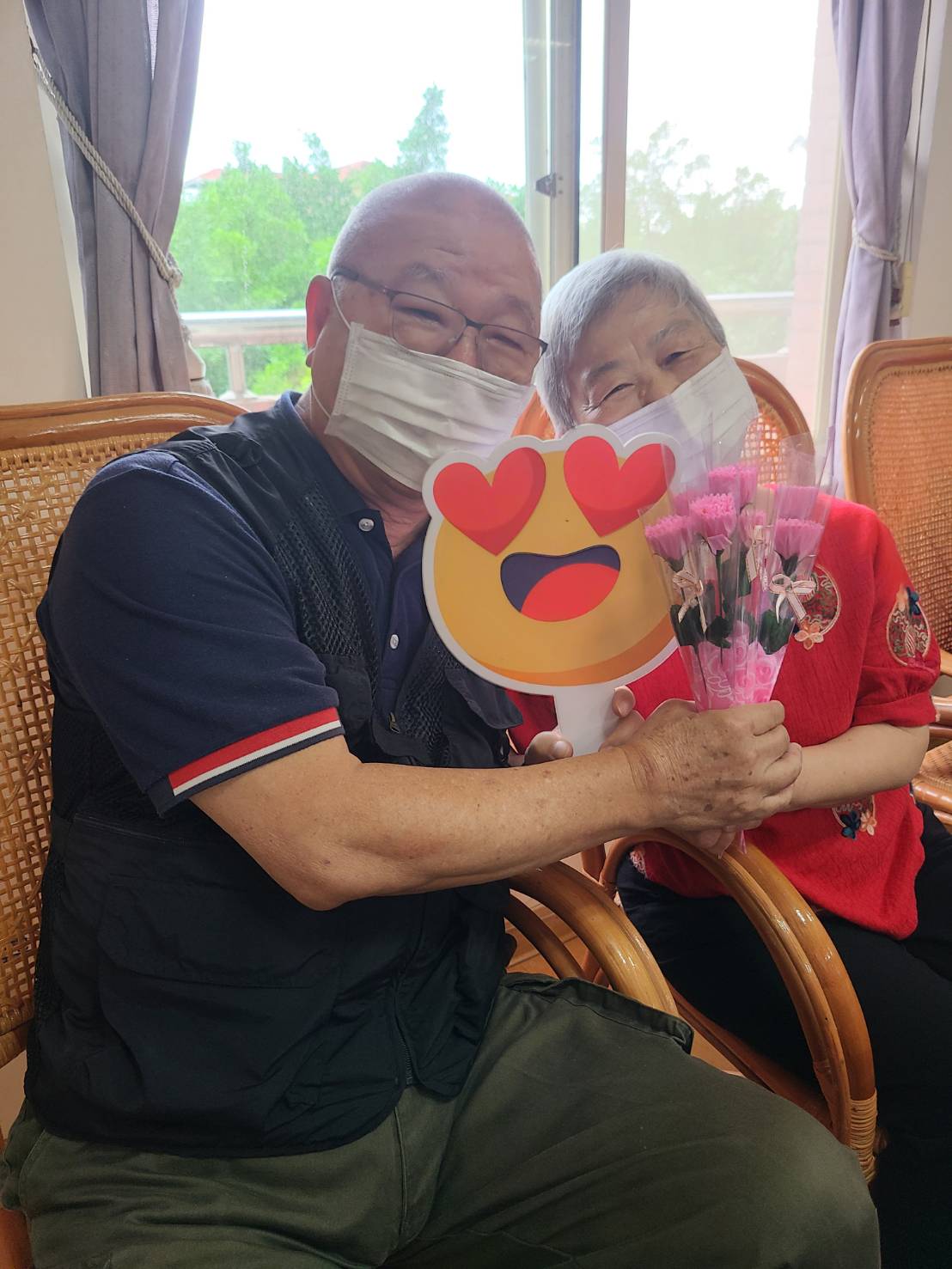 今(5)日上午於百享堂舉辦「啾愛媽咪同樂會」活動,邀請榮家5對夫妻及女性住民參加。榮家準備了母親節蛋糕,以及粉色香皂作成的康乃馨花朵,除象徵偉大的母愛,也提醒在疫情期間隨時記得勤洗手。住民阿姨們在接過花束瞬間燦爛的笑容,現場洋溢著溫馨的氛圍。