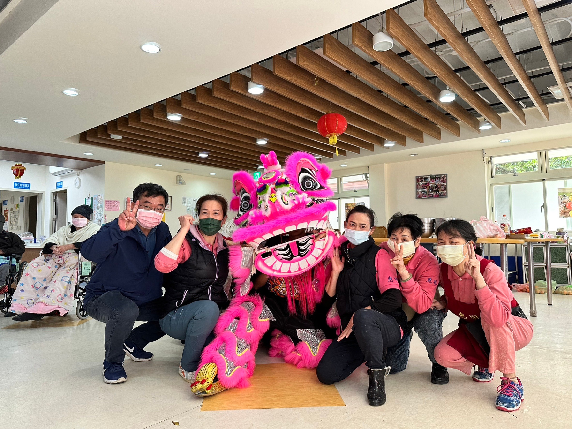 祥獅繞行家區至養護堂與照護工作團隊合影氣氛喜慶溫馨
