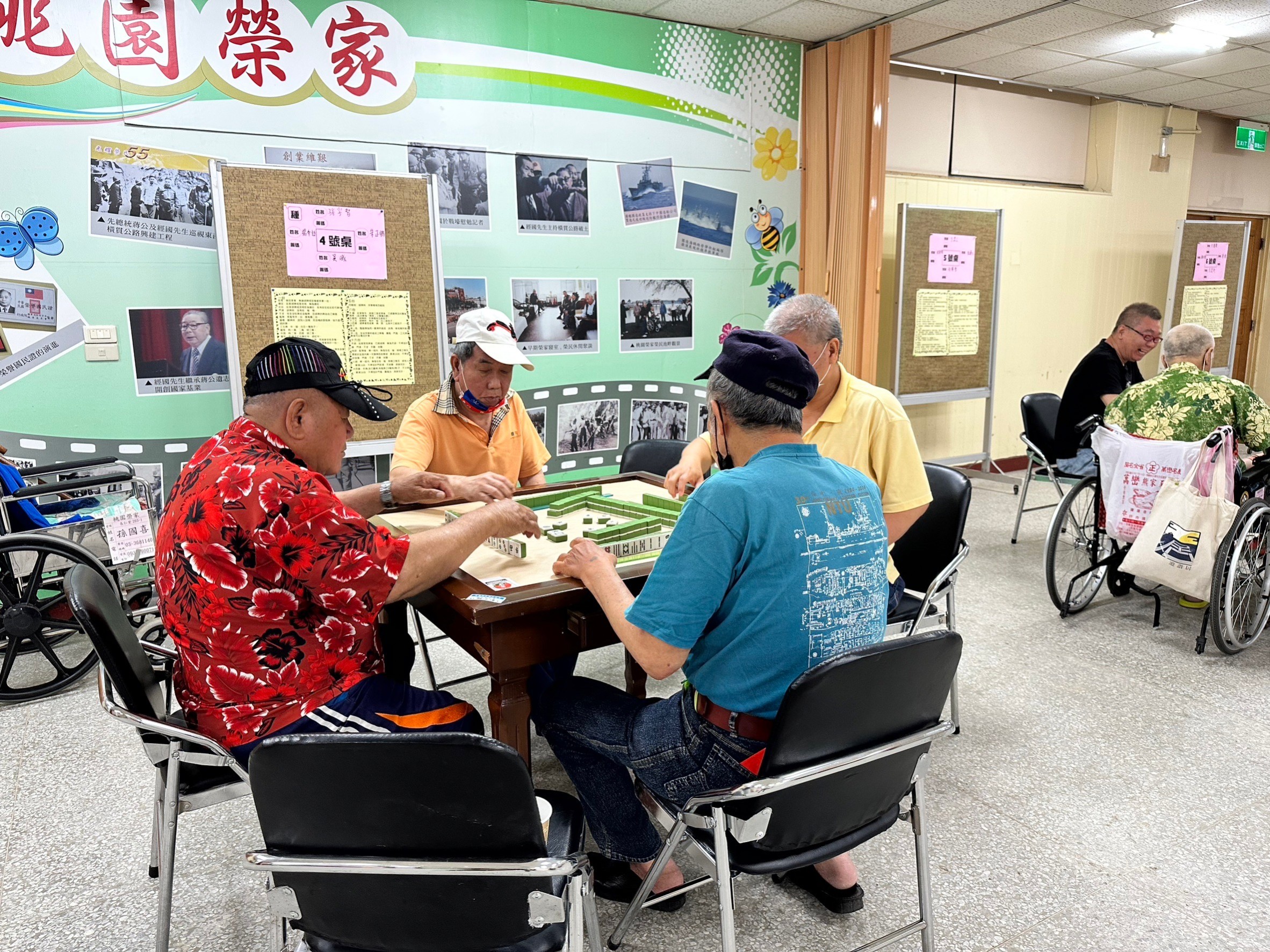 桃園榮家於今(5)日在家區簡報室舉行「樂齡麻將王大賽」,參賽長輩平均年齡為78歲,選手當中最年長為民國2年出生的百歲人瑞孫爺爺,千歲老人齊聚現場大顯身手,本次活動特別製作「麻將至尊就是我」的閃亮背帶,增添比賽趣味性。