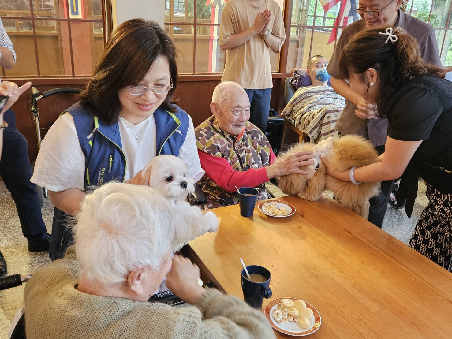 達清環保公司章卉庭副總經理為照顧桃園榮家長輩,於4/24偕同南亞技術學院藍忠賢副校長拜訪榮家,並捐贈 醫用製氧機1部及10萬元 章副總經理表示,得知榮家長輩有使用氧氣機改善低血氧及呼吸喘症狀之需求,特別安排捐贈行程,並攜帶3隻毛小孩 前來取悅榮家長輩,讓長者健康樂活。榮家受贈住民代表葉伯伯看到毛茸茸的萌犬,禁不住將其抱在懷裡呵護 場面溫馨感人。章副總經理感懷表示,父親也是榮民,原本很高興申請入住桃園榮家,卻在入住前3天過世;3隻毛小孩是父親生前最愛的玩伴寵物,看到長輩擁抱萌犬的愉悅模樣,彷彿看到父親在榮家悠然頤養的身影,心中充滿感動