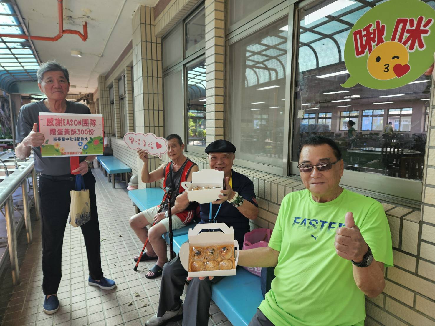 秋節將屆,Eason團隊募集蛋黃酥300份黑貓 宅配直送桃園榮家; 社團法人中華民國如實行益會理事長吳貴鈿率團隊一行4人,特別前來桃園榮家致贈月餅300份 ,祝賀長輩佳節愉快。拿到月餅的陳伯伯樂得闔不攏嘴,立即吃一口月餅,喝一口咖啡 頻頻豎起大拇指比讚 王阿姨則感謝贈禮的公益團隊,讓人備感窩心與暖意