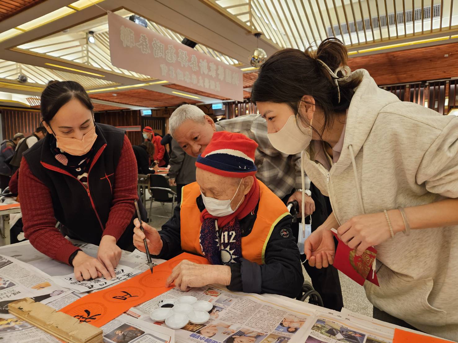 歡喜迎接乙巳蛇年,桃園榮家以「歡樂、活力、幸福」為主題規劃一系列春節慶祝活動 今(14)日登場為「小龍賜福新春揮毫」活動 邀請到由名家黃崑林老師帶領藝友雅集社團總計13位老師 於展演廳揮亳贈春聯,日照中心長者一同參與,老師們展現各家墨寶精髓、還有絹印、手繪春聯 榮家準備咖啡 果汁及節慶茶點,笑聲隆隆,現場充滿濃濃的年味