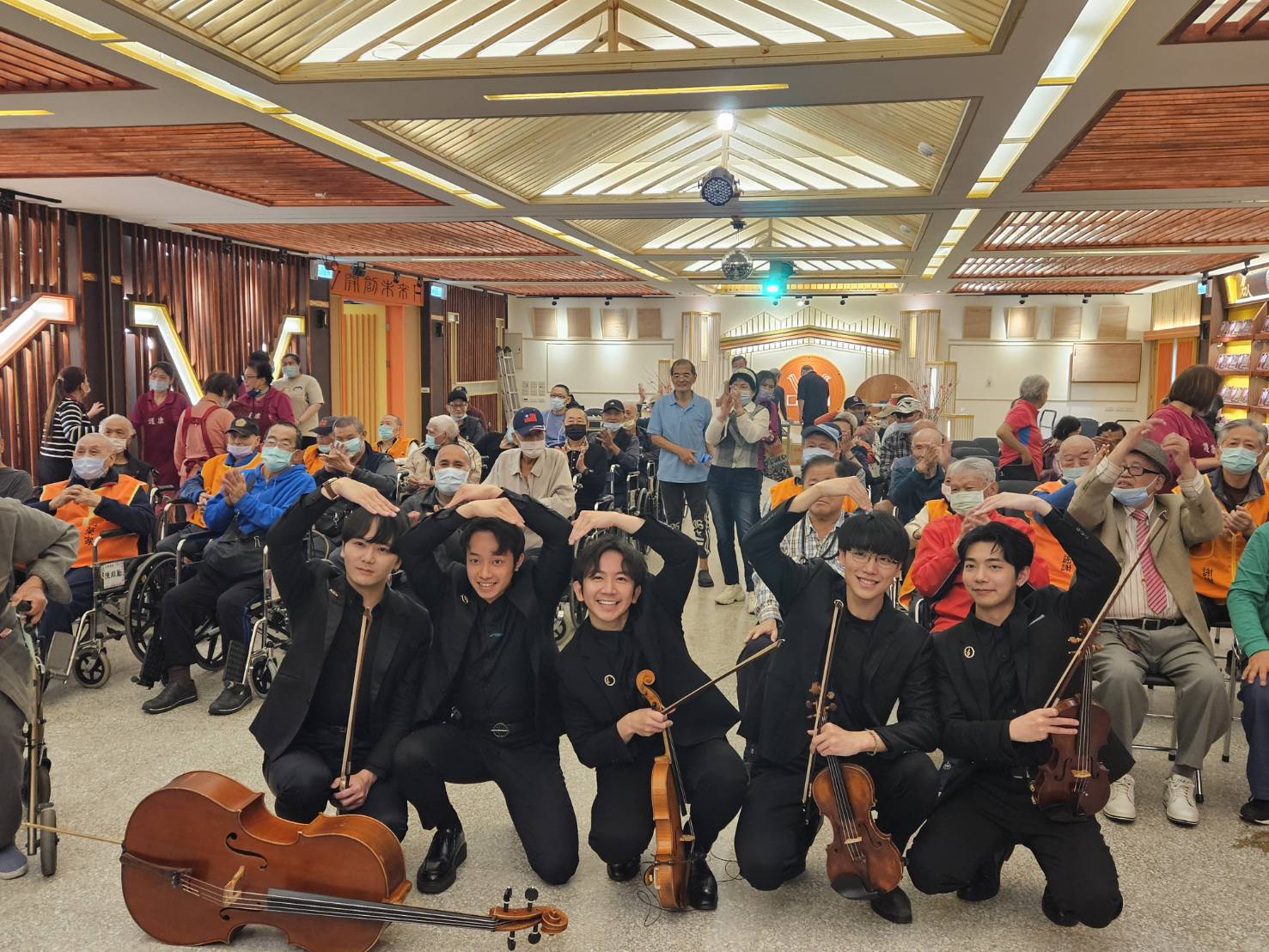 聆聽美好繽紛春天,8%ice男子弦樂團  於今(26)日午後來到桃園榮家展演廳舉辦公益音樂會,5位青春洋溢的樂手  運用弦樂及鋼琴交織出雋永的經典歌曲  帶領長者在春日的光影中憶起舊時的美好,音樂跨越世代連結彼此,弦樂的共鳴合奏讓長輩驚艷不已,現場掌聲不斷  共度美好的樂音時光
