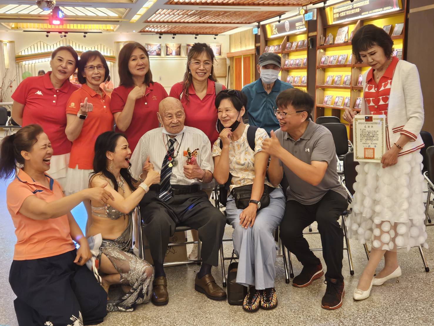 桃園榮家榮民李桂芳伯伯,恰逢端午連假百歲壽辰 榮家特於今(22)日攜手八德社區大學,提前為李伯伯舉辦百歲壽誕暨住民歡樂慶生會 精心熱情洋溢的肚皮舞 有氧帶動及活力律動,祝賀長輩福壽安康、活力滿滿 榮家主任陳平帶領一級主管、照顧團隊為伯伯祝壽,女兒亦特別到場獻上溫情的祝福,現場喜氣洋洋