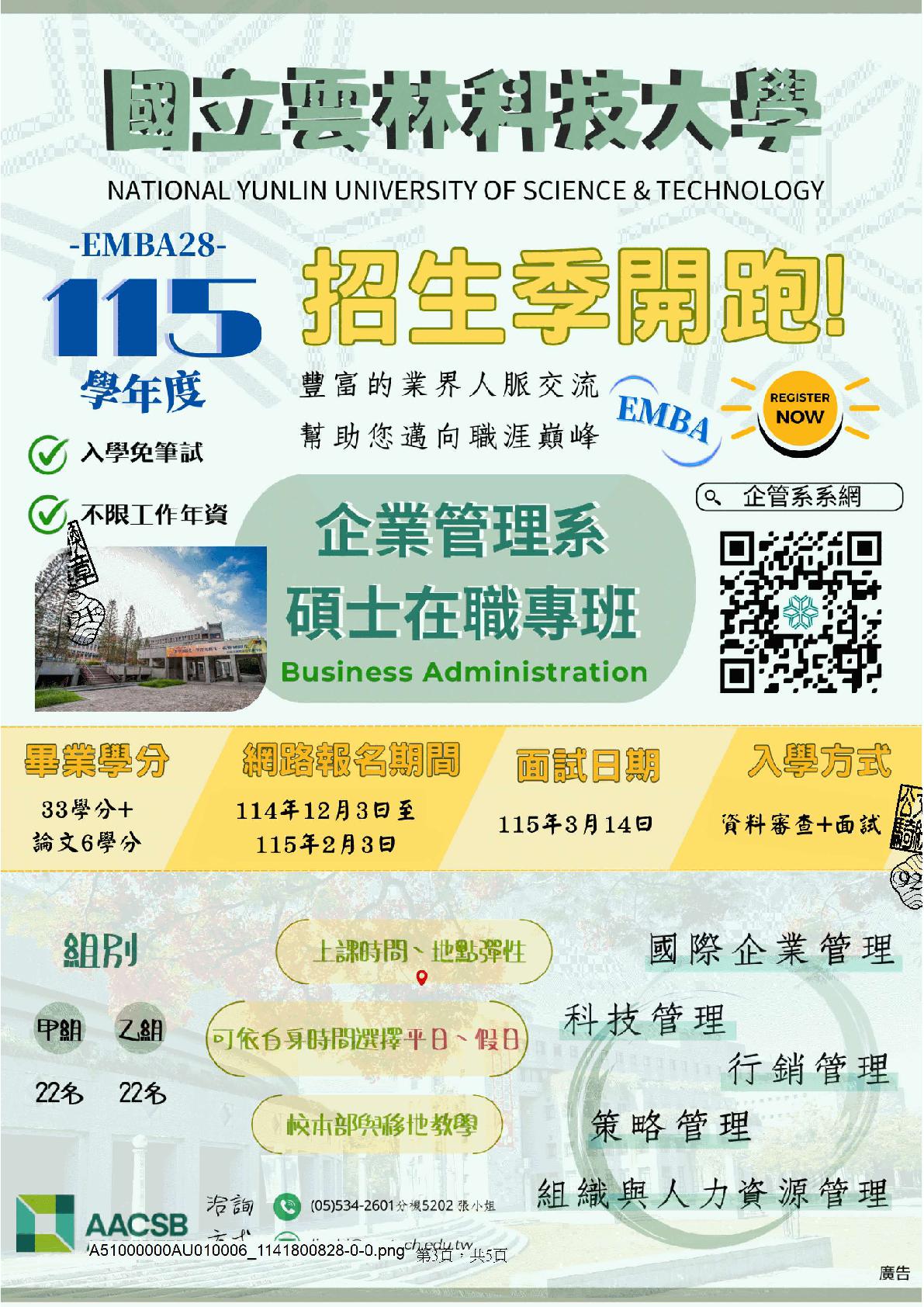 國立雲林科技大學企業管理系115學年度碩士在職專班招生訊息: 報名期間:即日起至115年2月3日。 面試日期:115年3月14日(免筆試)。