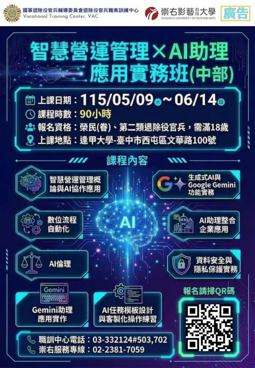輔導會職訓中心委外班【智慧營運管理×AI助理應用實務班(中部)】假日班 熱烈招生中,趕快來報名唷~~~!
