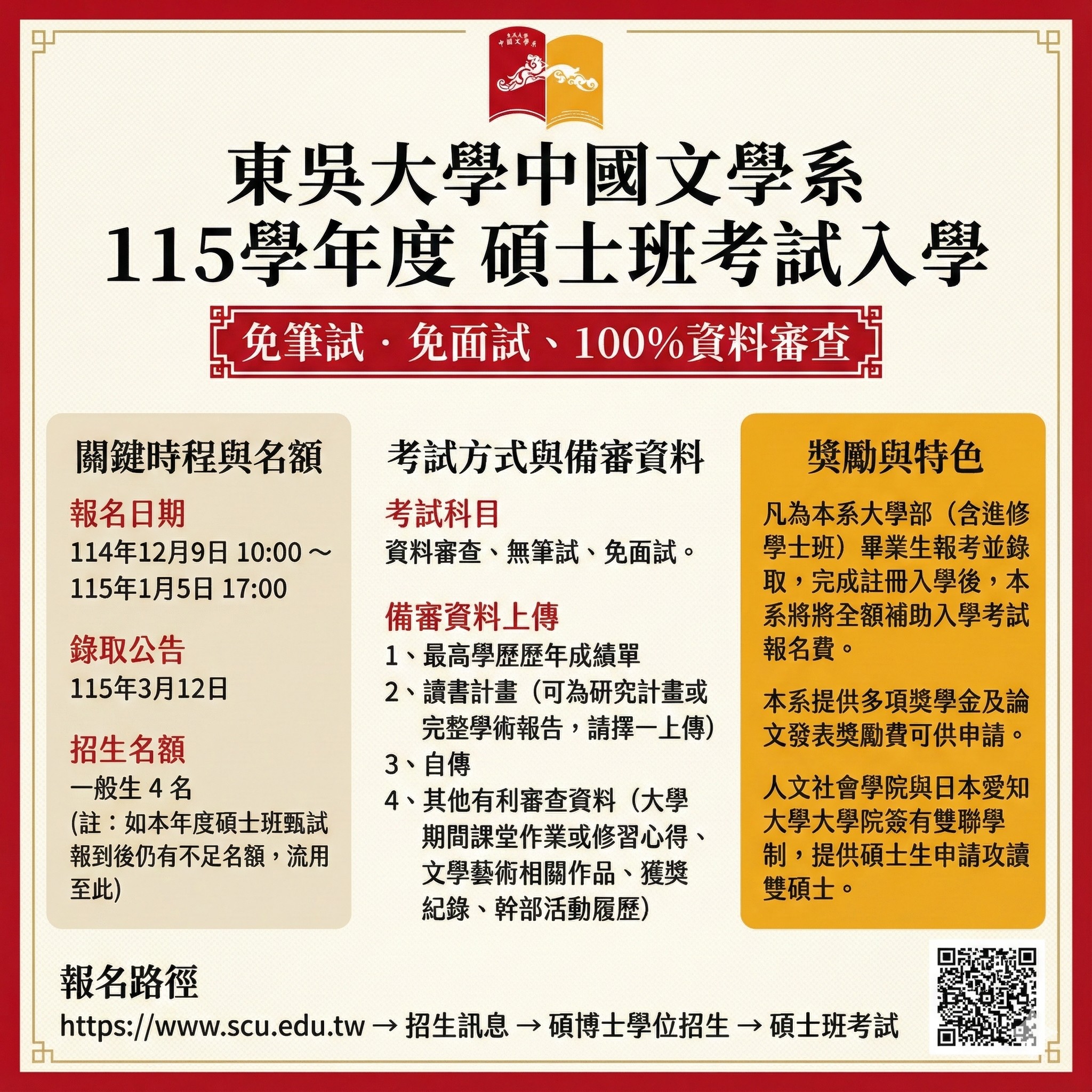 東吳大學中國文學系115年度碩士班入學考試