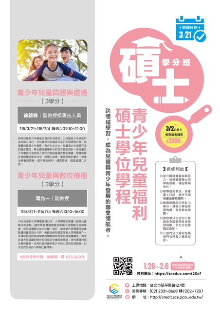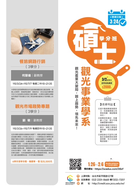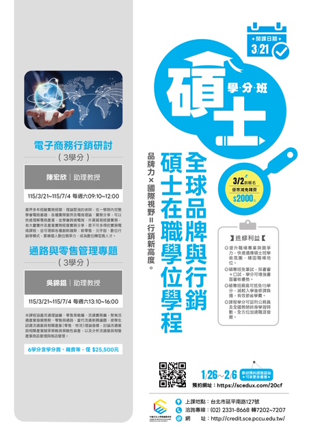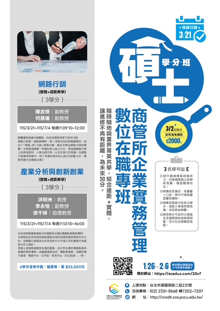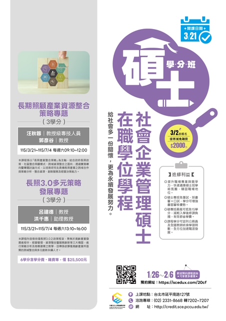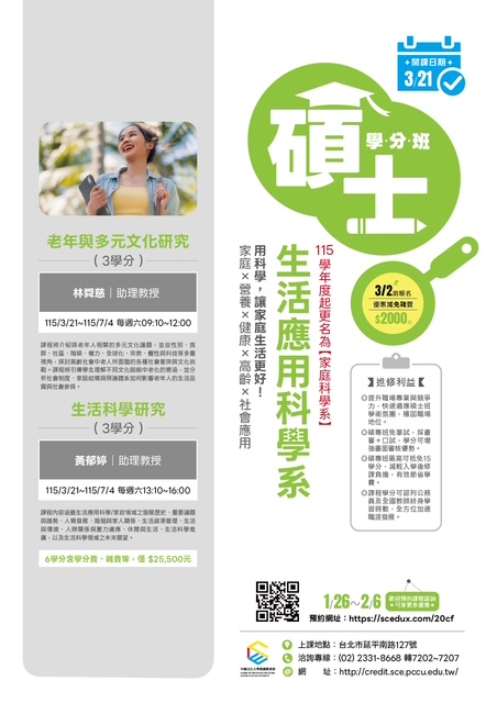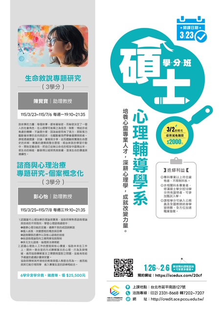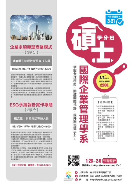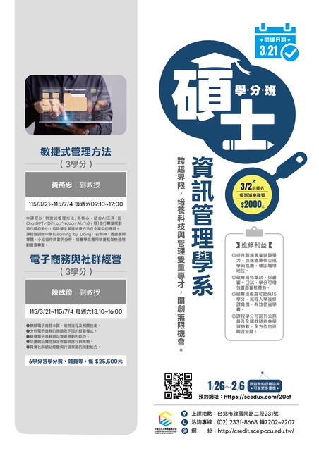 中國文化大學【碩士學分班】熱烈招生中~ 升級自己,開啟新篇章——再唸碩士,為夢想加速! 升級,從來不是因為你不夠努力,而是因為你還少了一些學分加持。 加入我們的碩士學分班,與來自各行業的精英智者同行, 這不僅是學習的起點,更是您提升領導力與洞察力的絕佳平台。 在這裡,年齡只是數字,智慧才是最珍貴的財富。 碩士學分班進修利益 ●提升職場專業與競爭力,預先適應碩士教學模式,強化專業實力