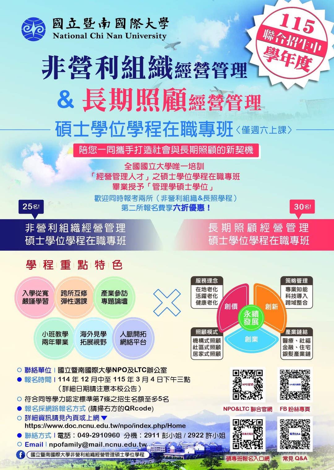 國立暨南國際大學115學年度非營利組織經營管理(NPO) & 長期照顧經營管理(LTC) 在職碩士學程聯合招生: 網路報名期間:114年12月31日(三)上午9:00起至115年03月04日(三)下午3:00止 學程聯合官網:https://www.npo-ltc.ncnu.edu.tw/ 招生名額 報名優惠與資格 洽詢電話: