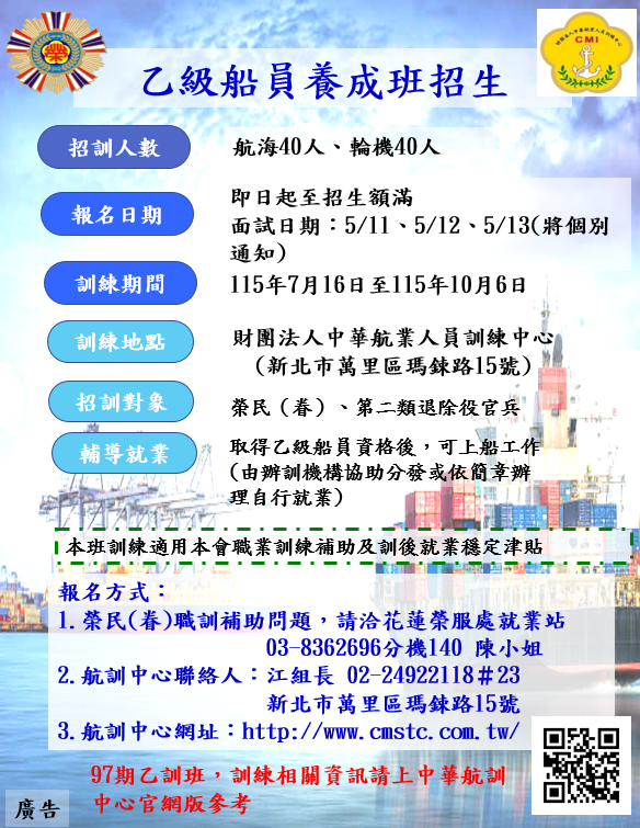 中華航業人員訓練中心乙级船員養成班第 97 期甄試通知單 一、甄試日期:115 年 5 月 11 日至 13 日。 分上、下午時段,請依寄發至個人之信件上所列 日期、時間參加,切勿遲到。若有問題者,請提早來電找江組長是否可變更日期時間。 二、甄試地點:新北市萬里區瑪鋉路 15 號(中華航訓中心,同地址另有其他單位,請參考下 一頁的圖示)。 三、招生班別:航海科、輪機科 四、甄試當日必須繳交: 1.報名費 2000 元。 2.身分證正反面影本(事先黏貼於表格內)、照片 1 張(1 或 2 吋,事先黏貼於表格內)。 3.自傳(請參考背面範例)。 4.船員體格檢查證明書(正本,中文),須至公立醫院(公立、榮總、軍醫院),【網站 有 109 年 4 月 22 日最新版空白表格如附件】,但衛生所及私立醫院不行。欲報名者須 注意醫院可領體檢表之時間長短。北部建議可在基隆市立醫院門診部體檢(基隆市中 正區義二路 2 巷 6 號,電話 02-24282146),若體檢流程無其他問題,可於當日上午 8 至 10 點前體檢,下午 3 點後取件。 5.最高學歷畢業證書影本(未達高中職學歷者請繳交國中畢業證書或高中職成績單,大 學肄業或二、三專科肄業者可繳交高中職畢業證書。五專未畢業者請繳交成績單。) 6.警察刑事紀錄證明(正本)-須為“全部時間”之紀錄證明【空白表格如附件】。 7.兵役證明(退伍令、結訓令或免役證明)。 8.政府或民間證照影本(如職訓局技能檢定、語言檢定成績等)---如果持有請附上。 【附註:繳交資料列為錄取之重要依據】 五、錄取通知:甄試合格者,將於網站上公告錄取名單及報到須知。 連絡人:江組長。連絡電話:(02)24922118 分機 23,傳真:(02)24922117。