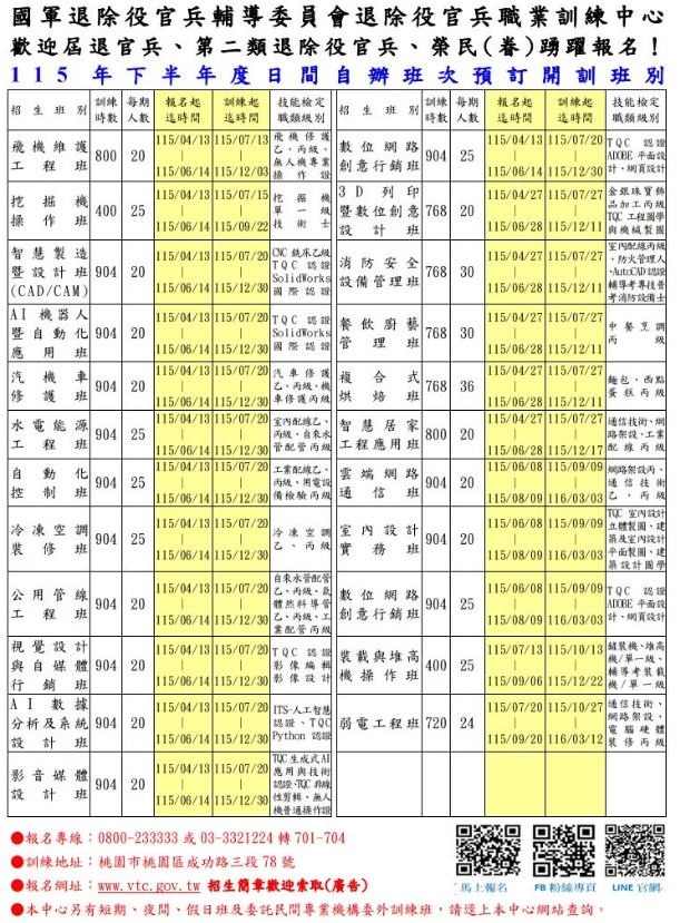 【職訓招生訊息】職訓中心-115年下半年自辦訓練報名簡章宣傳