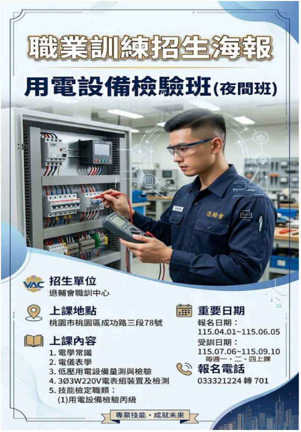 【職訓招生訊息】用電設備檢驗班(夜間班)增班訊息