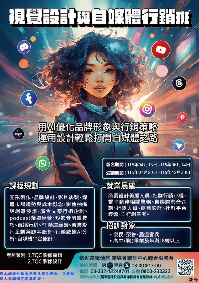 📢 退輔會職訓中心︱自辦︱「視覺設計與自媒體行銷班」開始報名囉!