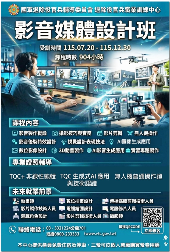 📢 退輔會職訓中心︱自辦︱「影音媒體設計班」開始報名囉!