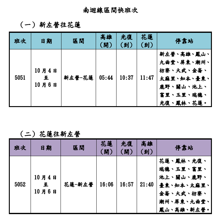 日期:114/10/03 資料來源:國營臺灣鐵路股份有限公司 因應中秋連假期間花蓮縣光復鄉災後重建旅運需求,於114年10月4日至10月6日加開新左營=臺東=花蓮區間快車6列次,以提供充足運能。